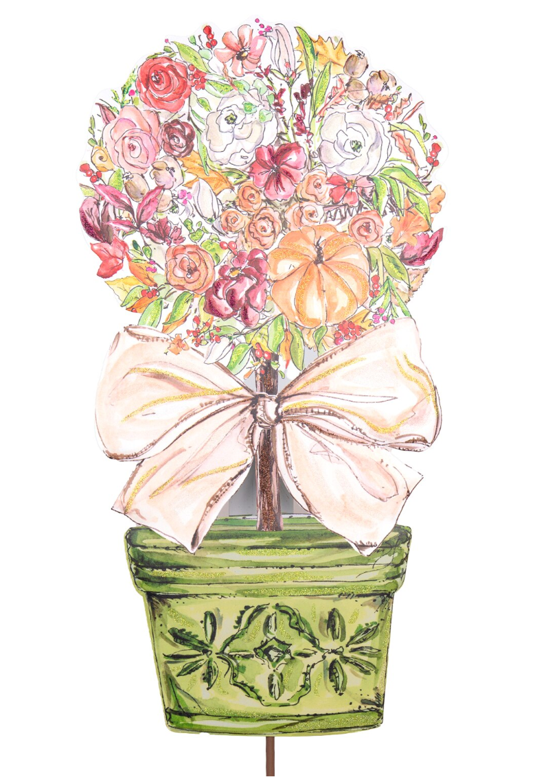 Celebrate the beauty of autumn with the Rose & Pumpkin Topiaries from the Round Top Collection. These elegant metal topiaries feature a lush arrangement of watercolor-style roses, fall foliage, berries, and a charming pumpkin nestled at the center—tied together with a soft, oversized bow and a classic green planter base. Available in small and large sizes, they make a stunning statement in entryways, on porches, or tucked into a fall-themed garden display. Mix and match sizes for a layered seasonal look full of warmth and whimsy!