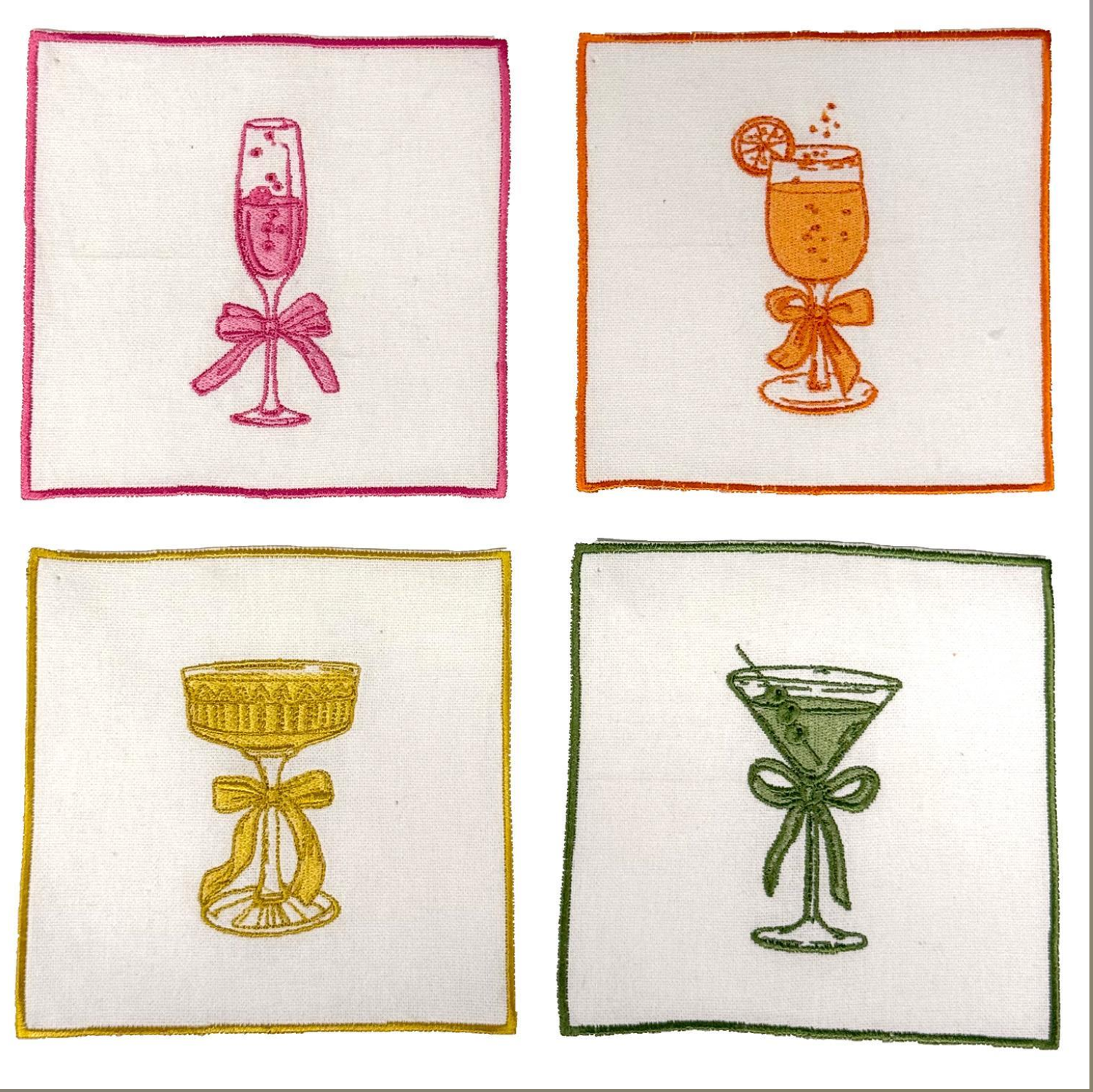 Add a stylish touch to your gatherings with this embroidered cocktail napkin set, featuring four classic drink designs. Each napkin showcases a different cocktail glass, accented with a charming bow detail. Crafted from soft cotton, they are perfect for entertaining or gifting to a cocktail enthusiast.