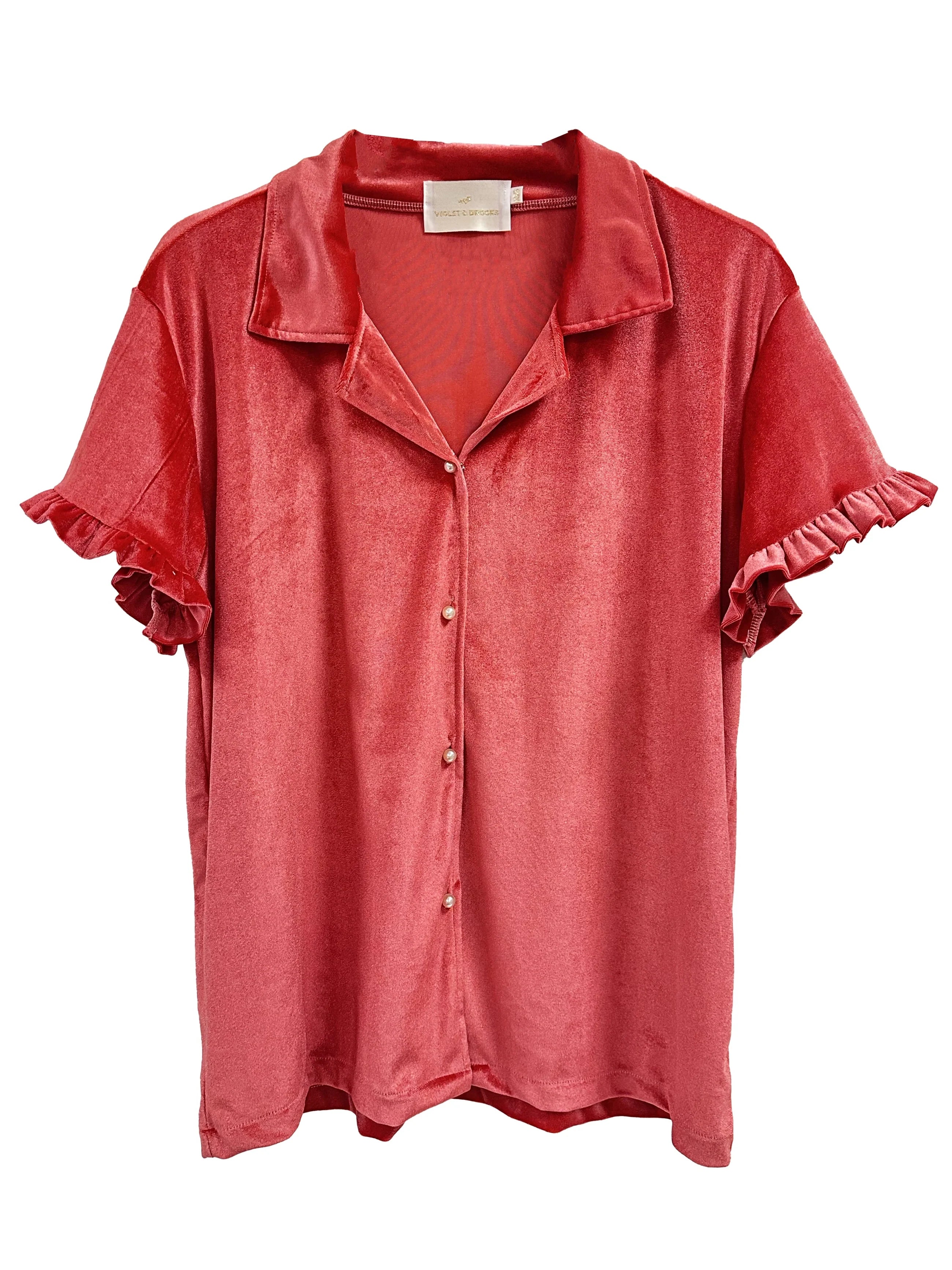 Say hello to Chloe: this must-have collection of lush & vibrant velvets. Stay Cozy in a best-selling Chloe Velvet Short Sleeve Top. Featuring pearl buttons and a staple ruffle detailing!