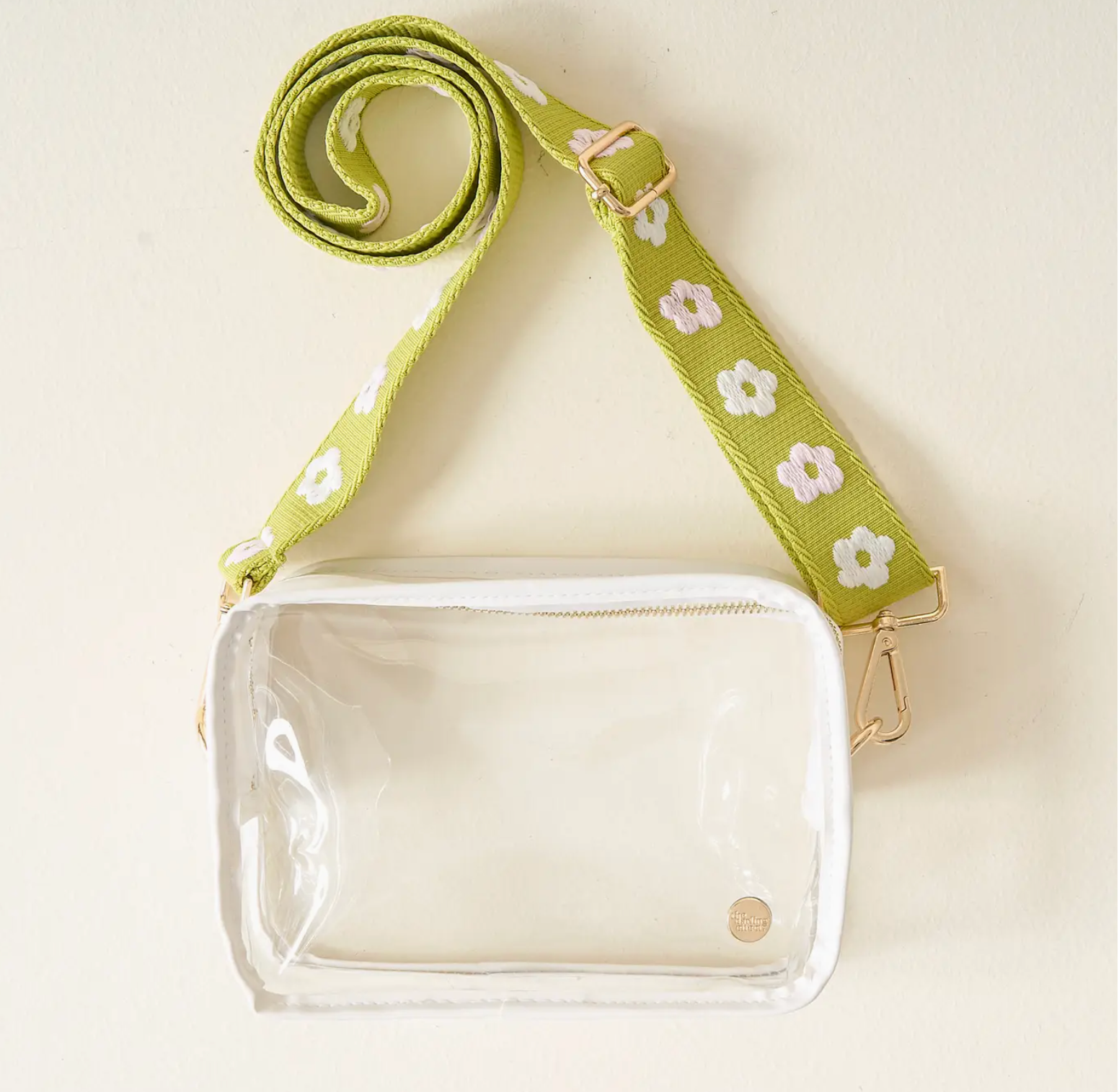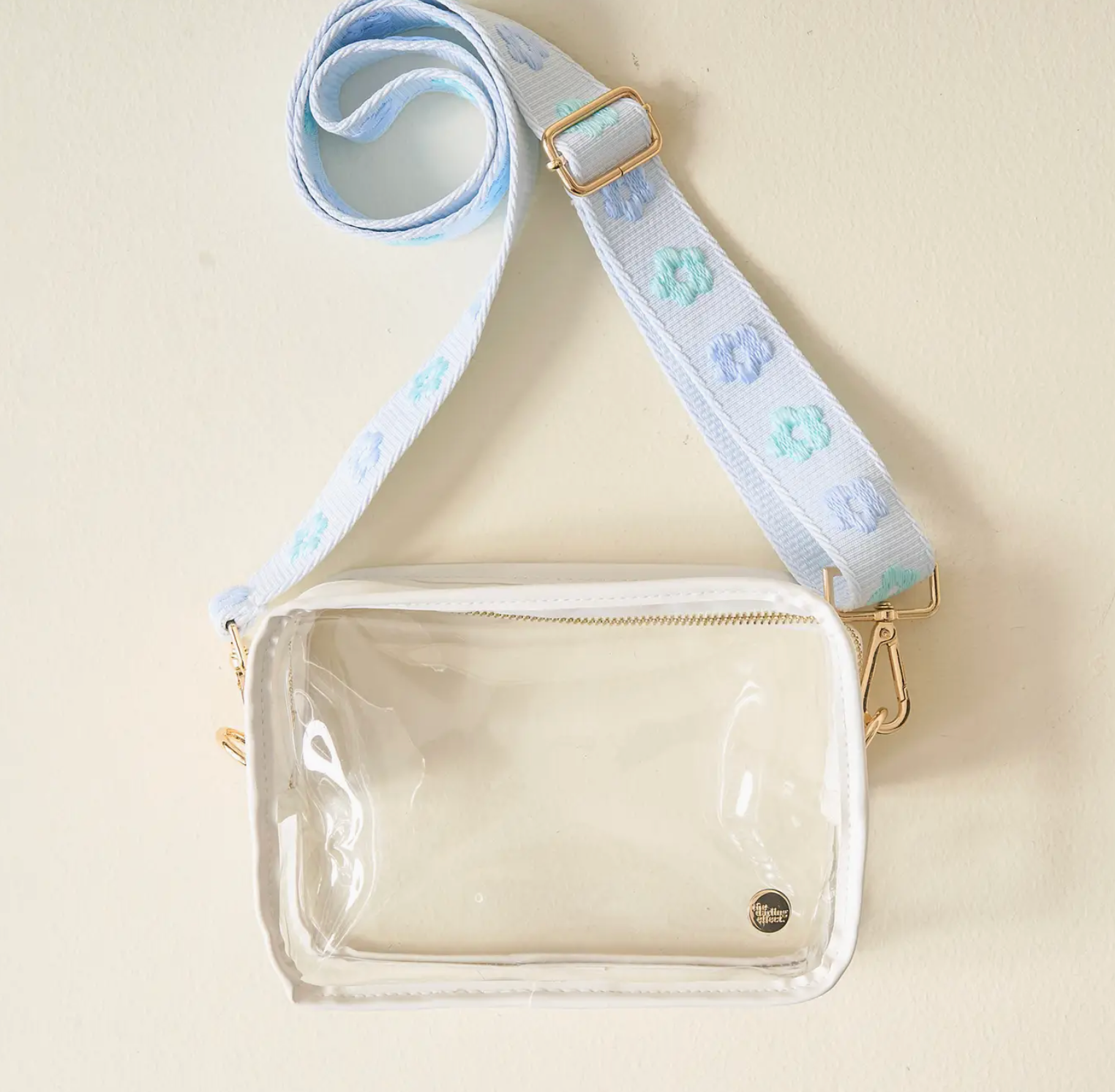 Our Clear Crossbody Bag will have you stadium ready to attend any upcoming concerts or events you may have! Dimensions: 7.75"x 6" Strap Length 26-49" Gold Hardware Details Adjustable Strap with Hooks Sized to fit stadium guidelines