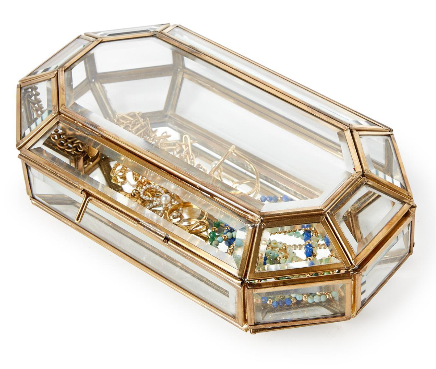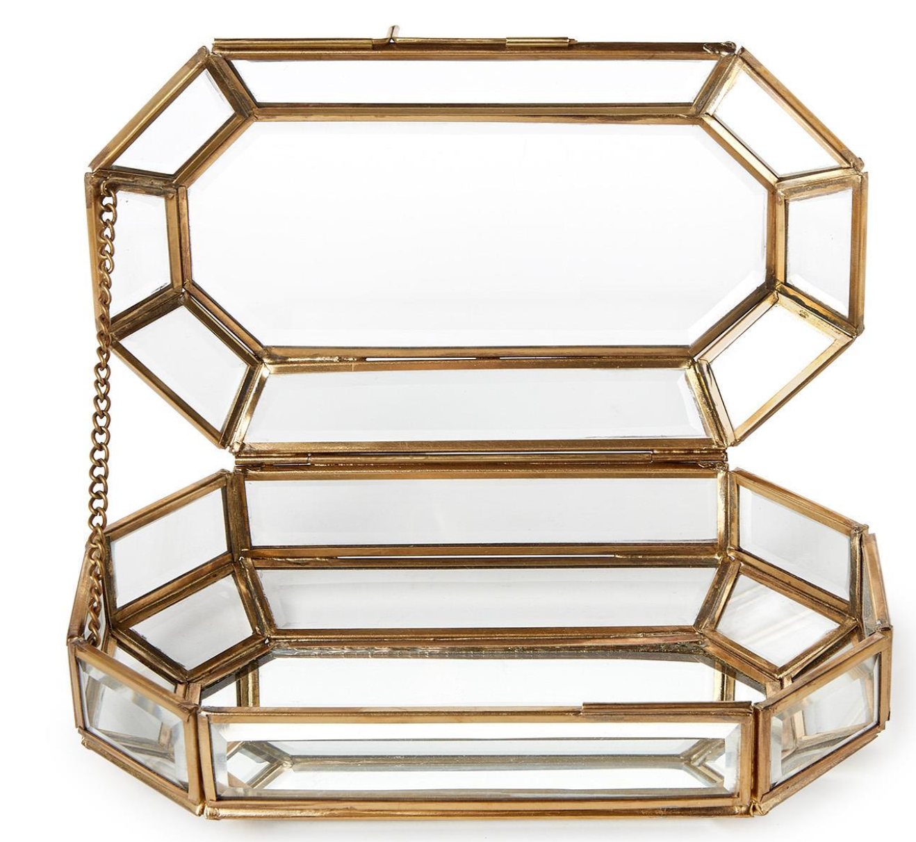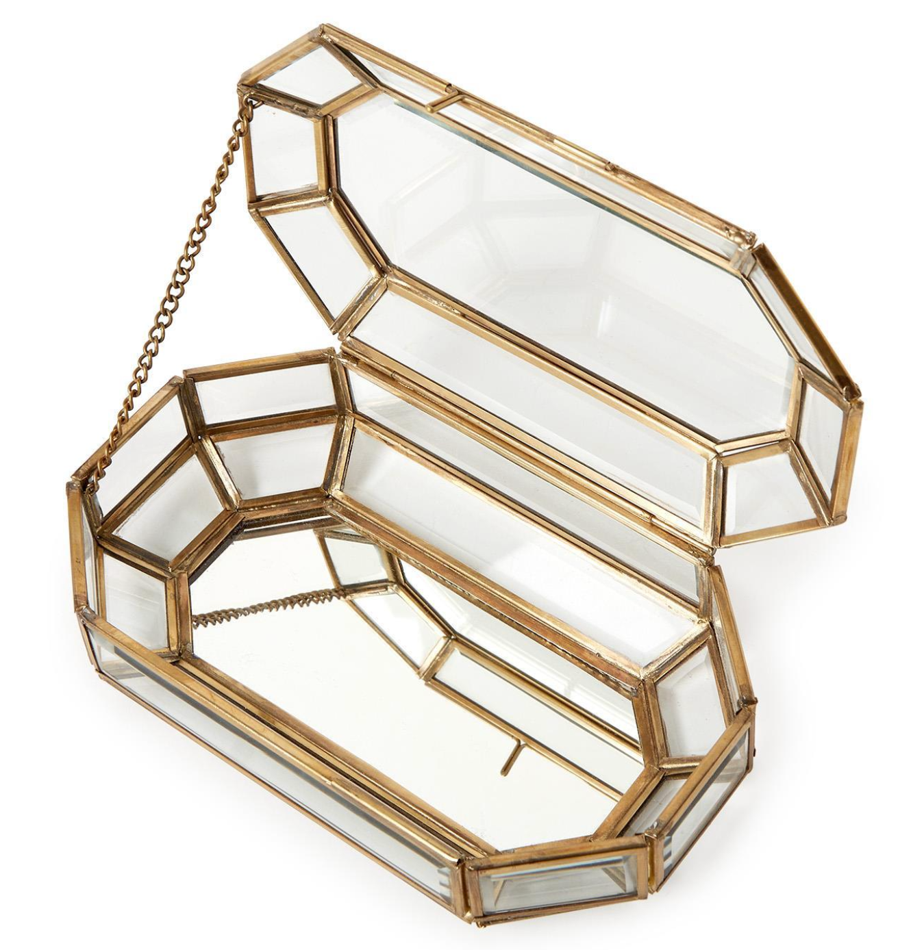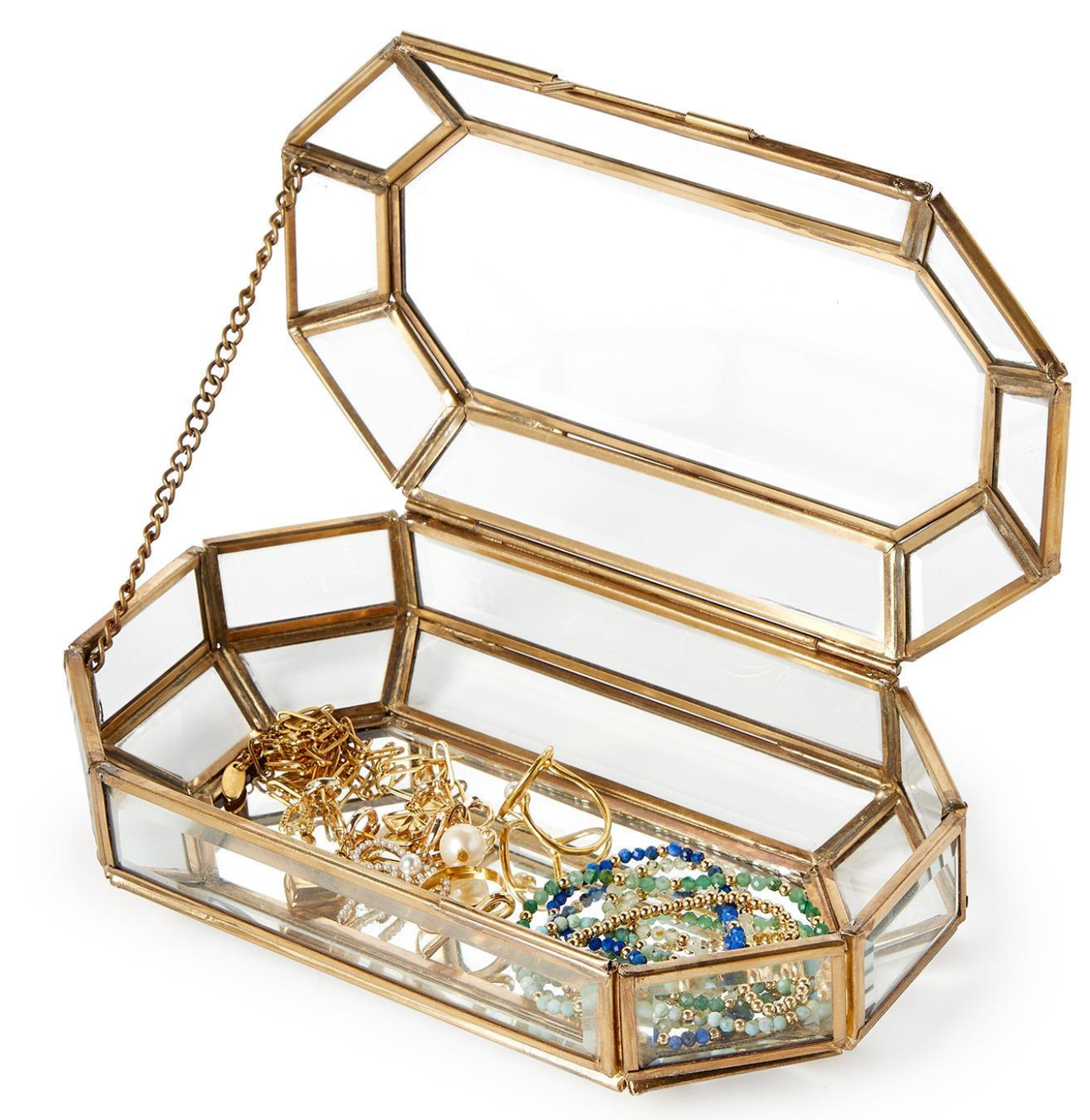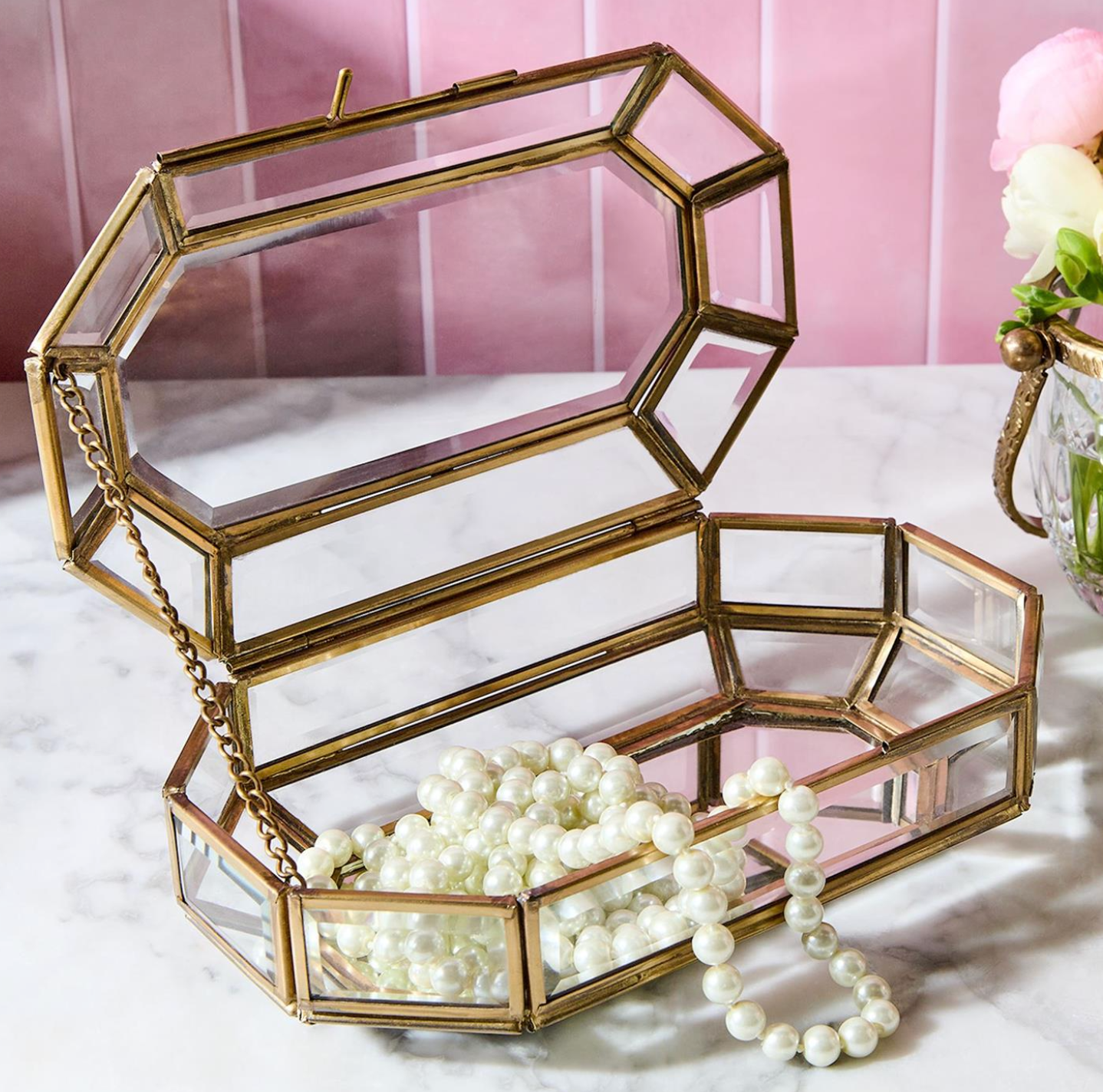 Indulge in a touch of elegance with our Glass Jewelry Box embellished with delicate Gold Antique Trim. Handcrafted with the finest glass and brass materials, this piece is as luxurious as it is functional. Ideal for showcasing your favorite pieces of jewelry while adding a glamorous touch to your vanity or dresser.