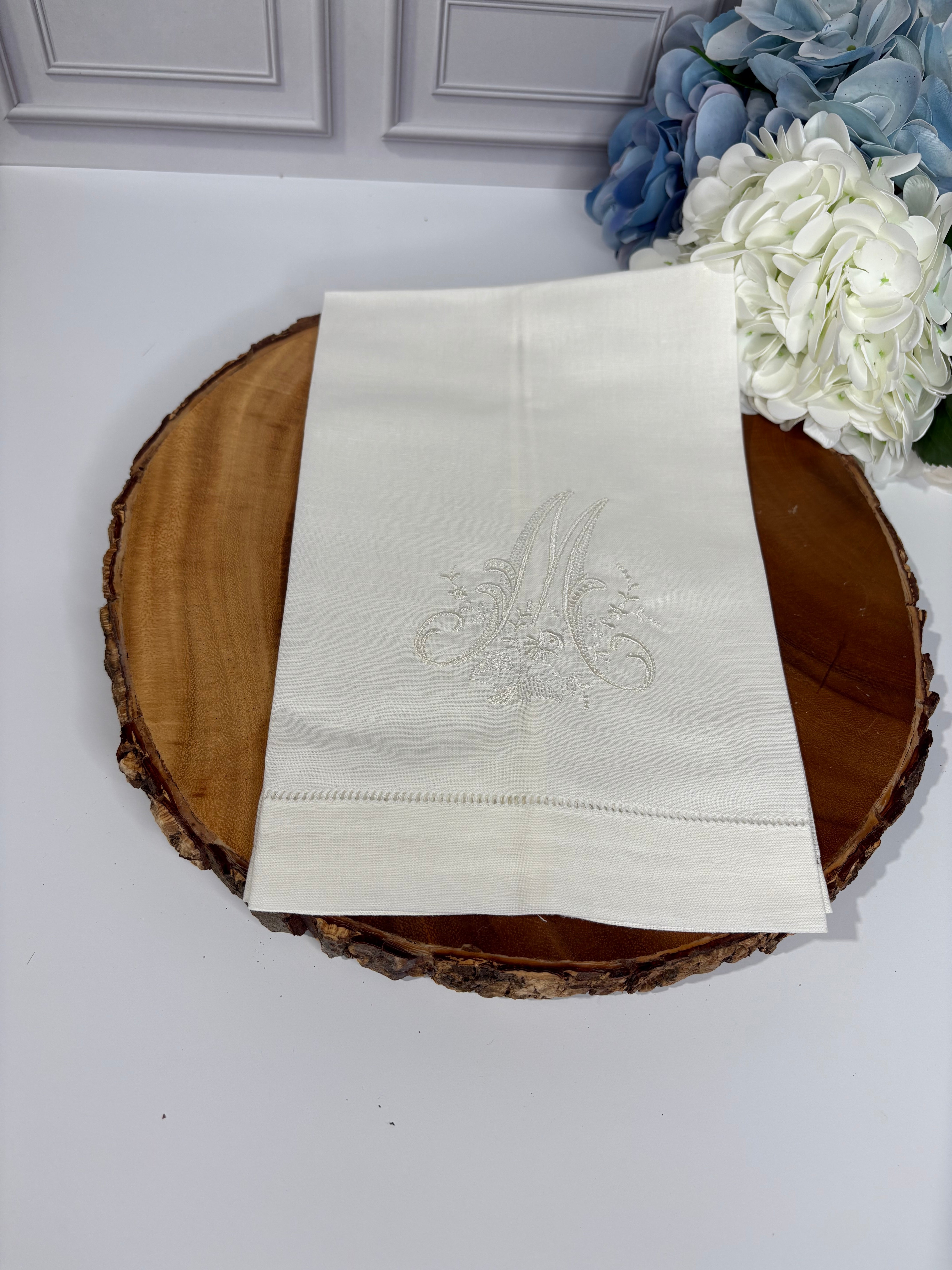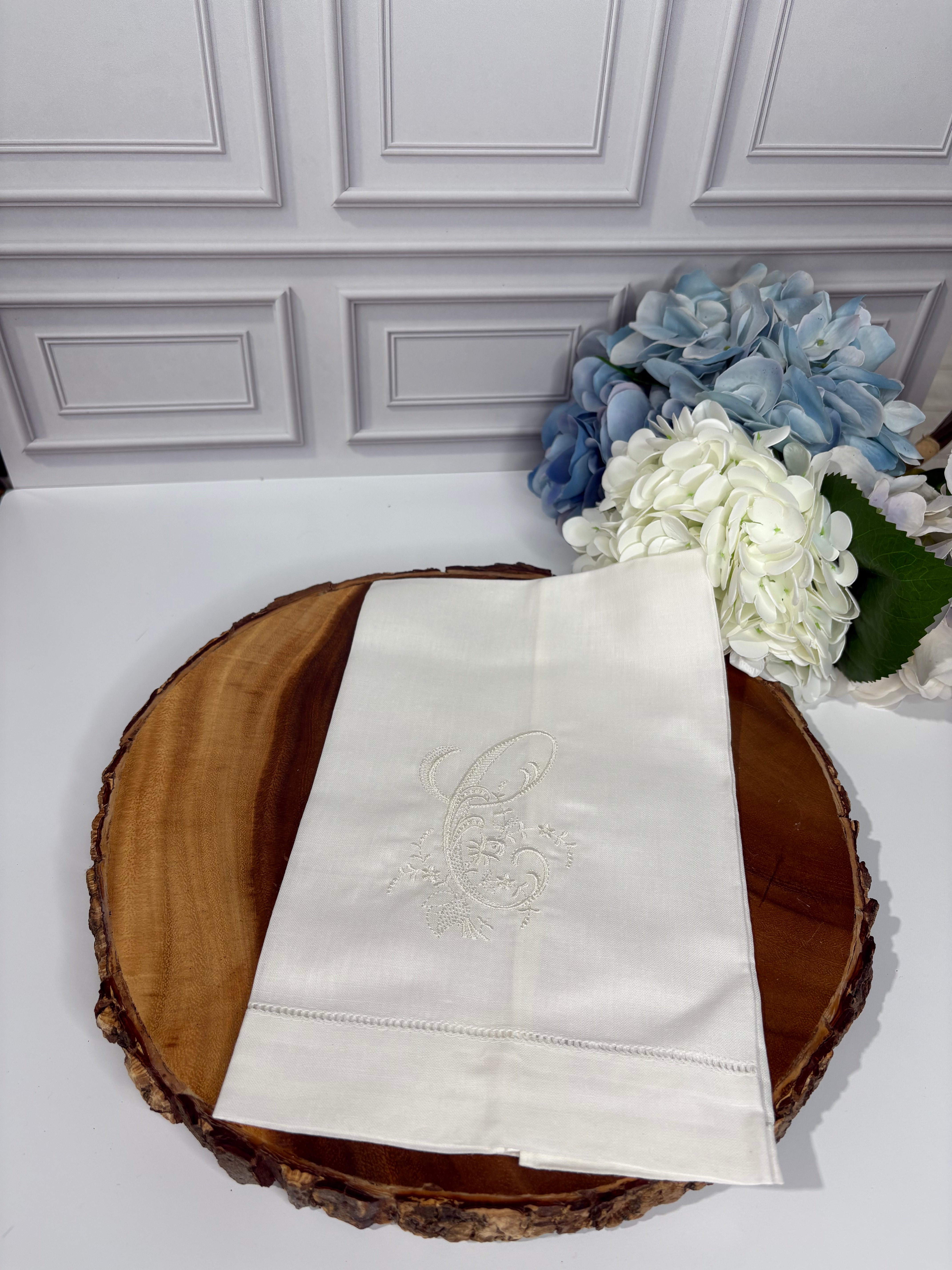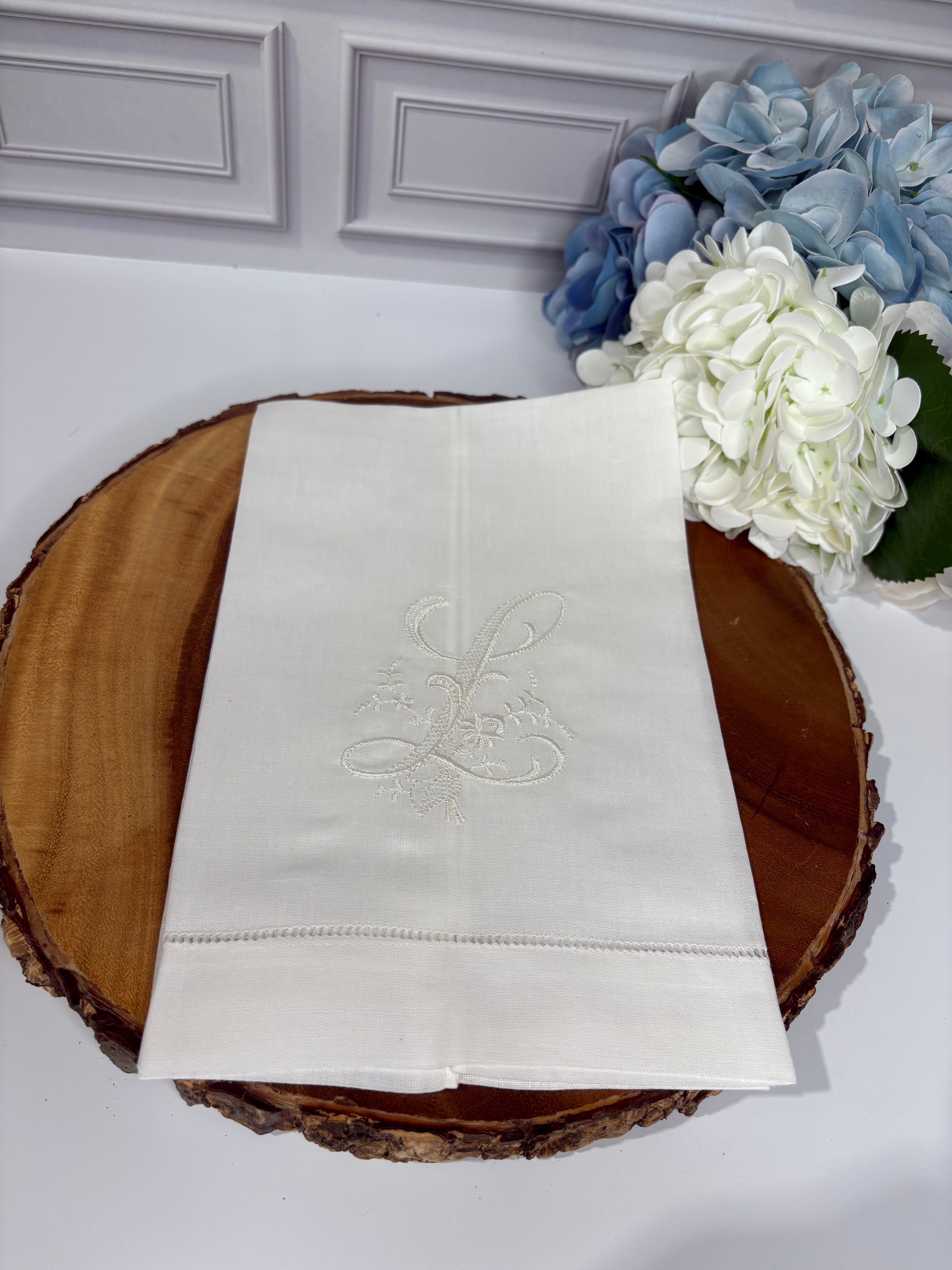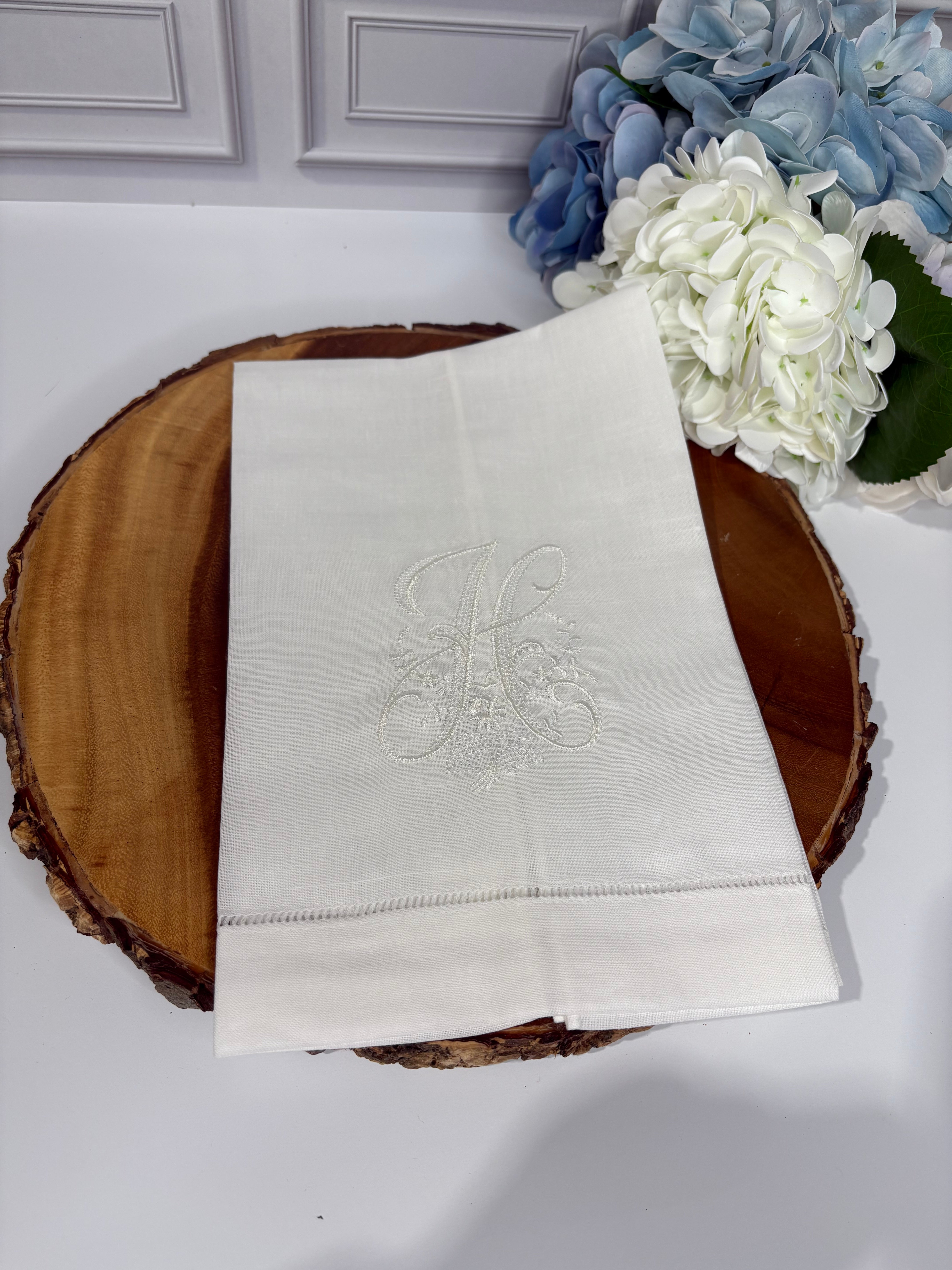 Elevate your guest bathroom with timeless elegance. This fine linen guest towel features a delicately embroidered script monogram, surrounded by intricate scrollwork and floral detailing. Crafted from high-quality linen, it offers a soft hand feel and refined texture, perfect for adding a sophisticated touch to your hosting essentials. Finished with a classic hemstitch border, this towel blends traditional charm with graceful luxury — ideal for special occasions or everyday indulgence.