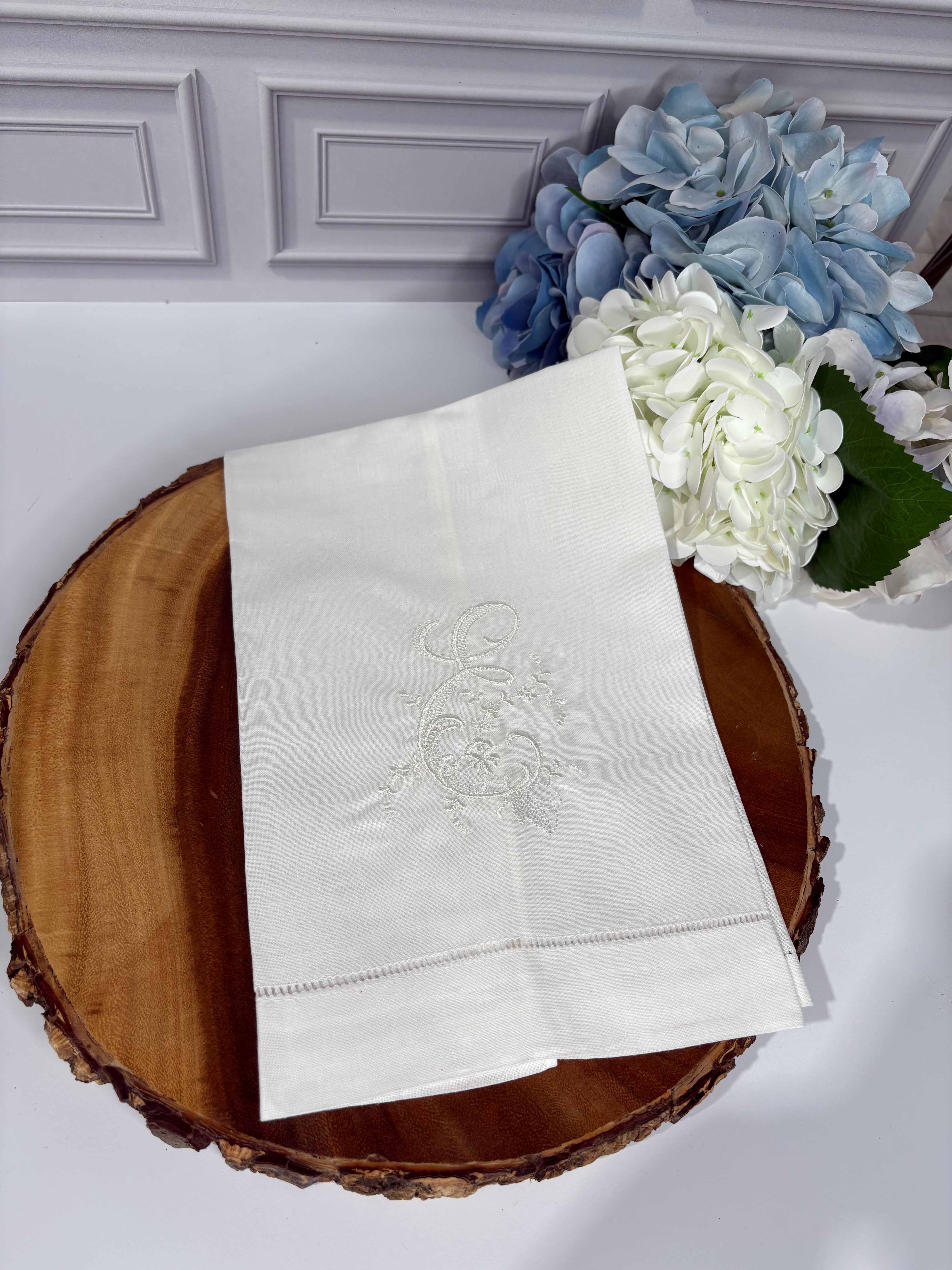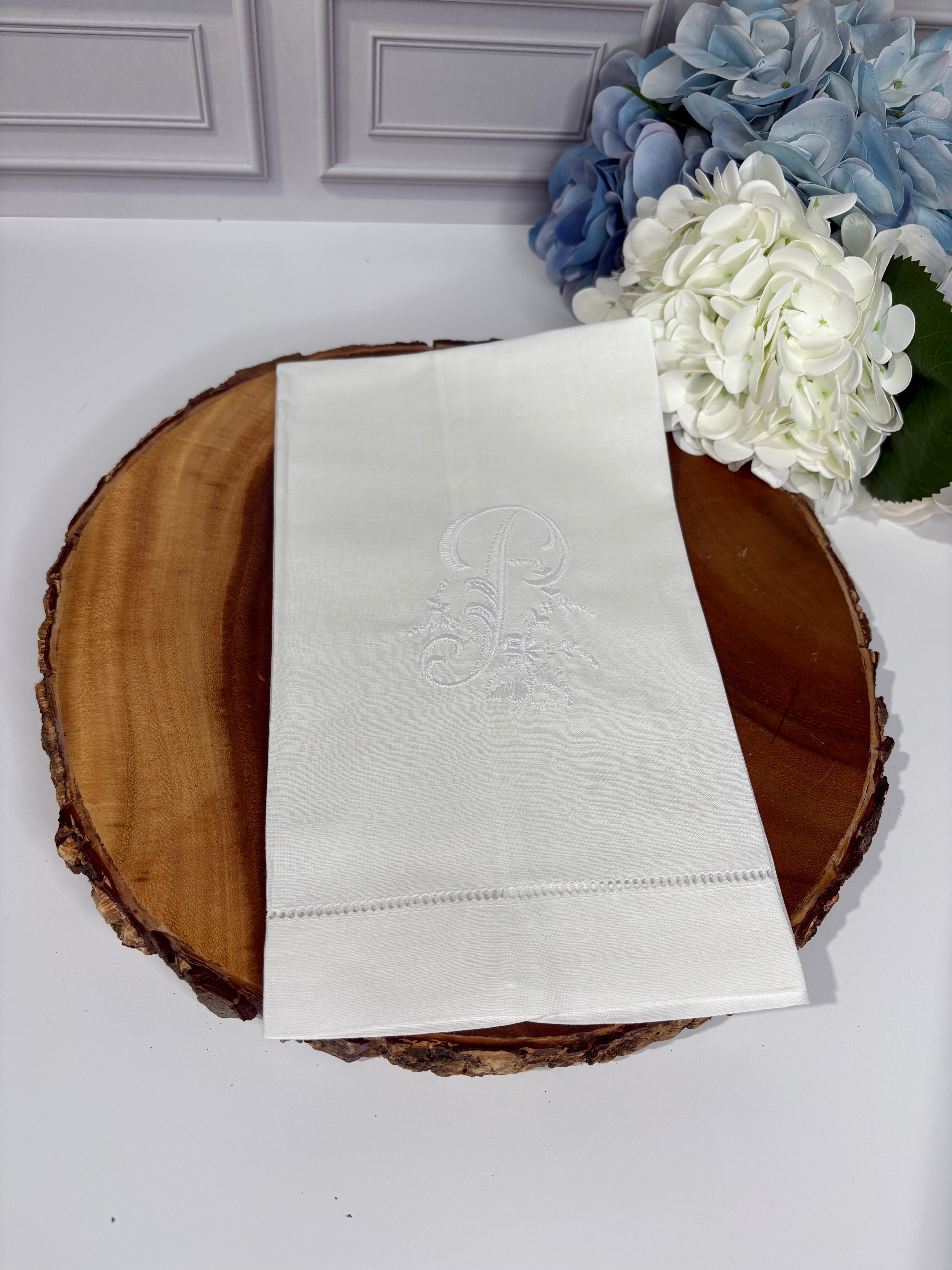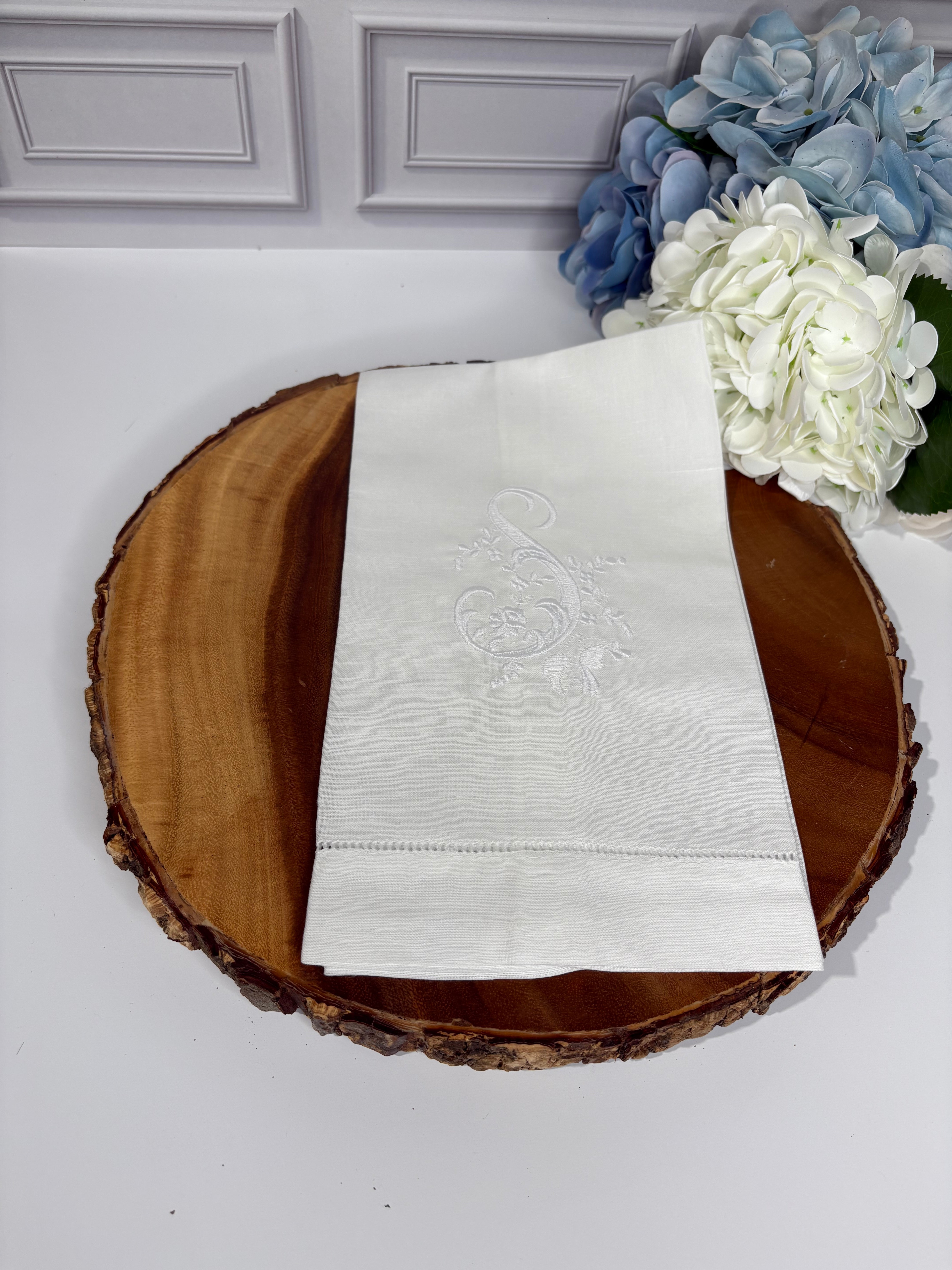 Elevate your guest bathroom with timeless elegance. This fine linen guest towel features a delicately embroidered script monogram, surrounded by intricate scrollwork and floral detailing. Crafted from high-quality linen, it offers a soft hand feel and refined texture, perfect for adding a sophisticated touch to your hosting essentials. Finished with a classic hemstitch border, this towel blends traditional charm with graceful luxury — ideal for special occasions or everyday indulgence.