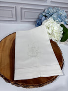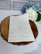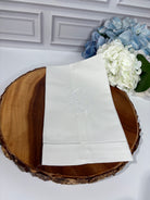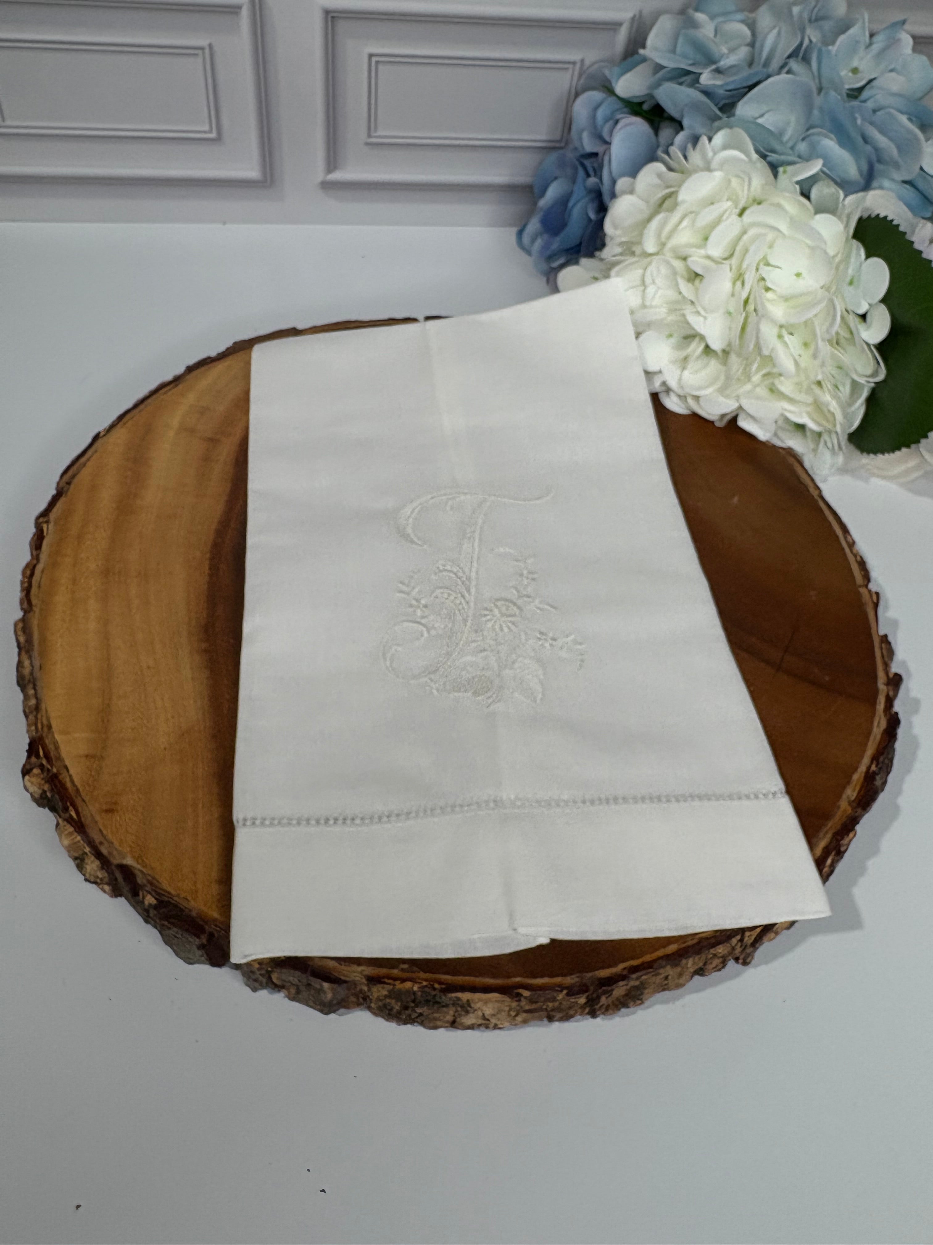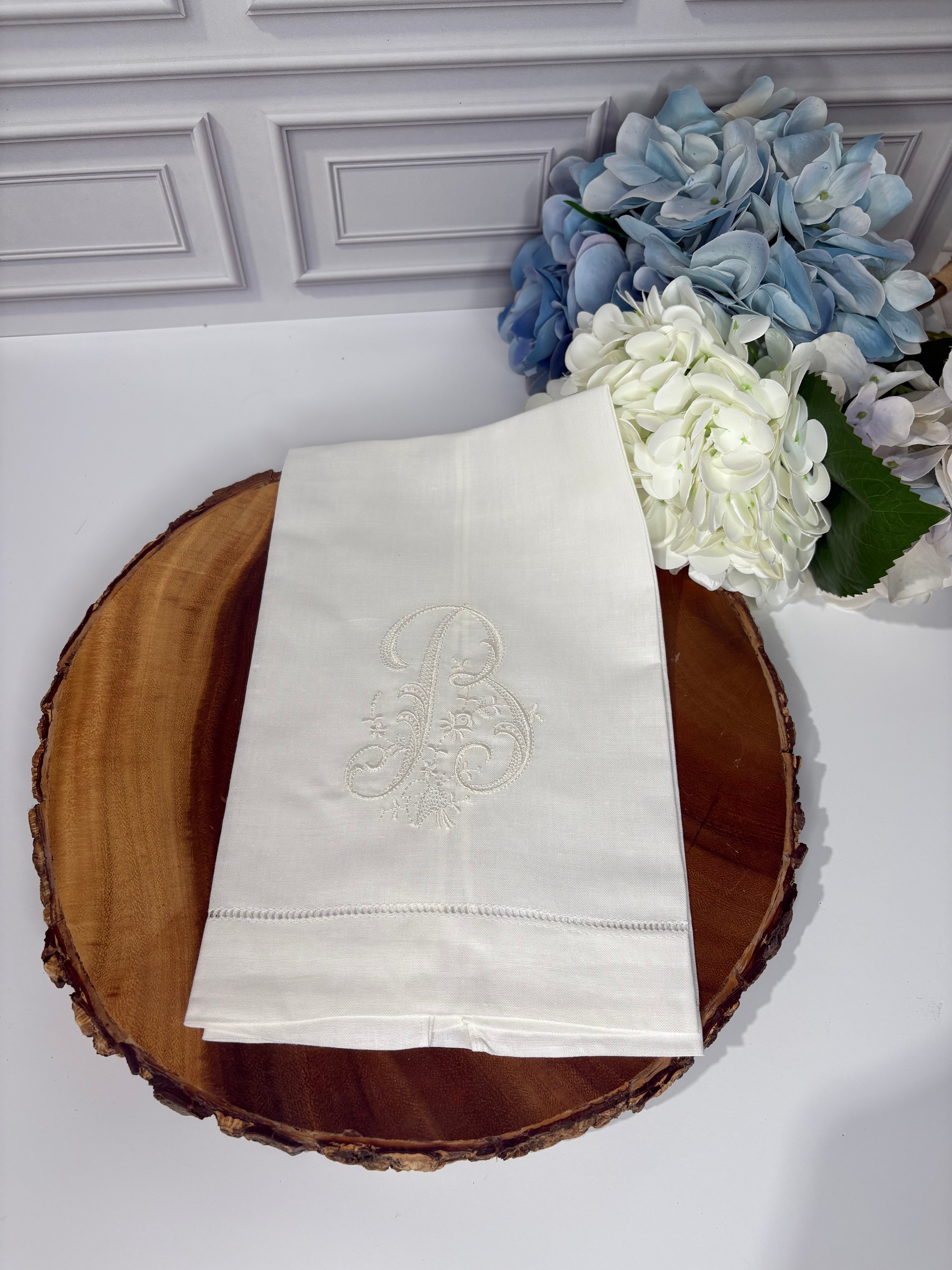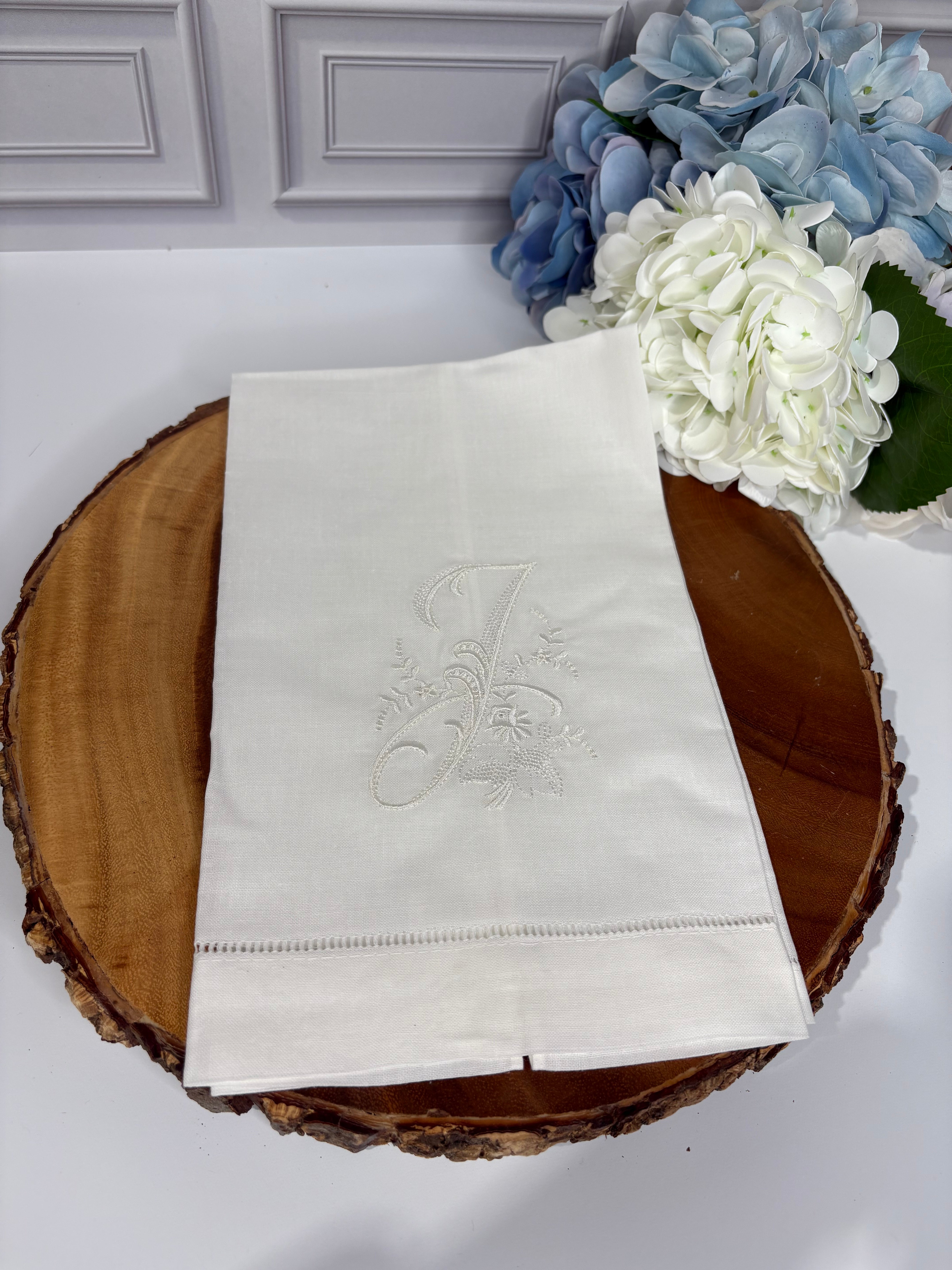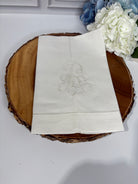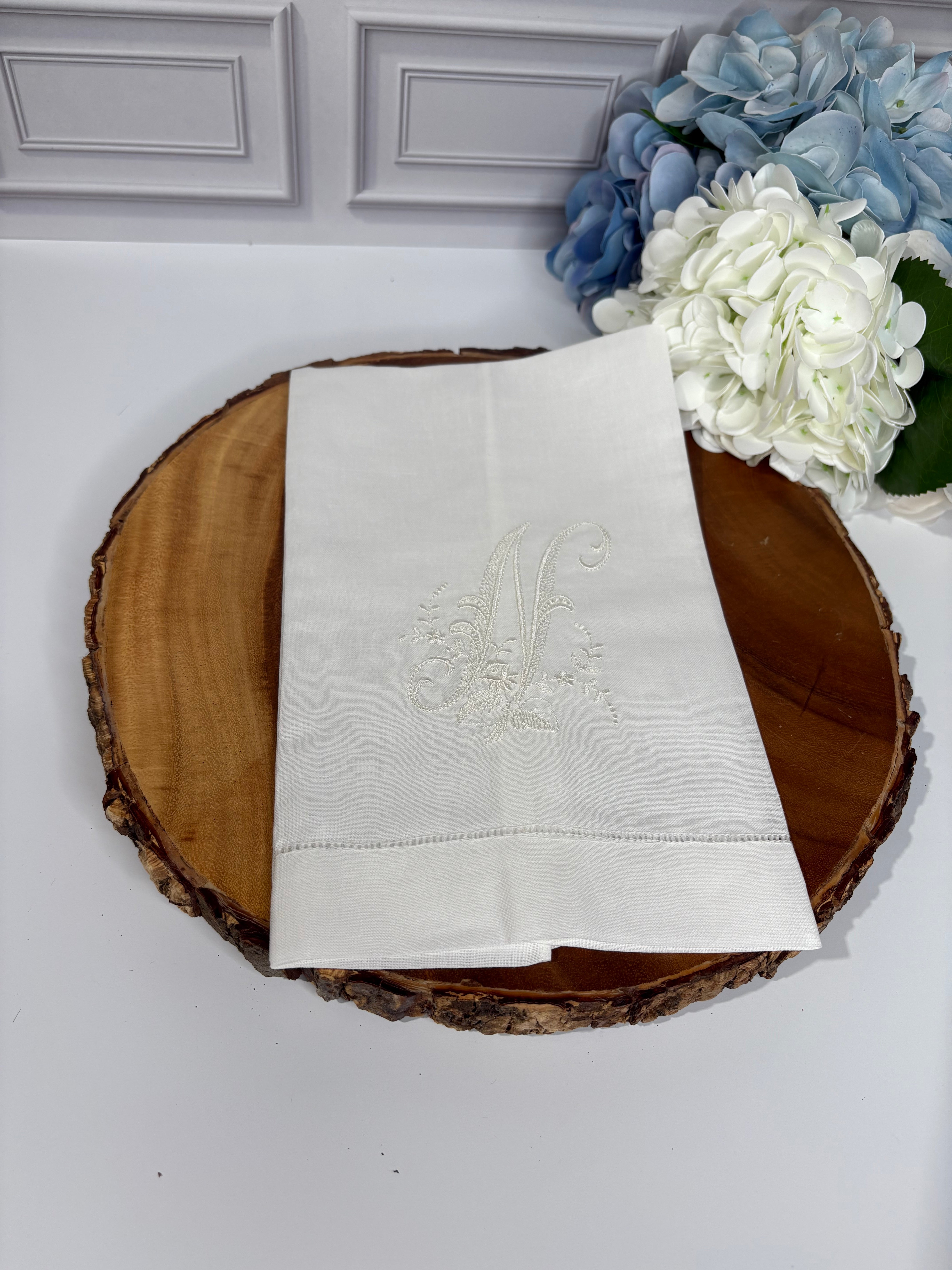 Elevate your guest bathroom with timeless elegance. This fine linen guest towel features a delicately embroidered script monogram, surrounded by intricate scrollwork and floral detailing. Crafted from high-quality linen, it offers a soft hand feel and refined texture, perfect for adding a sophisticated touch to your hosting essentials. Finished with a classic hemstitch border, this towel blends traditional charm with graceful luxury — ideal for special occasions or everyday indulgence.
