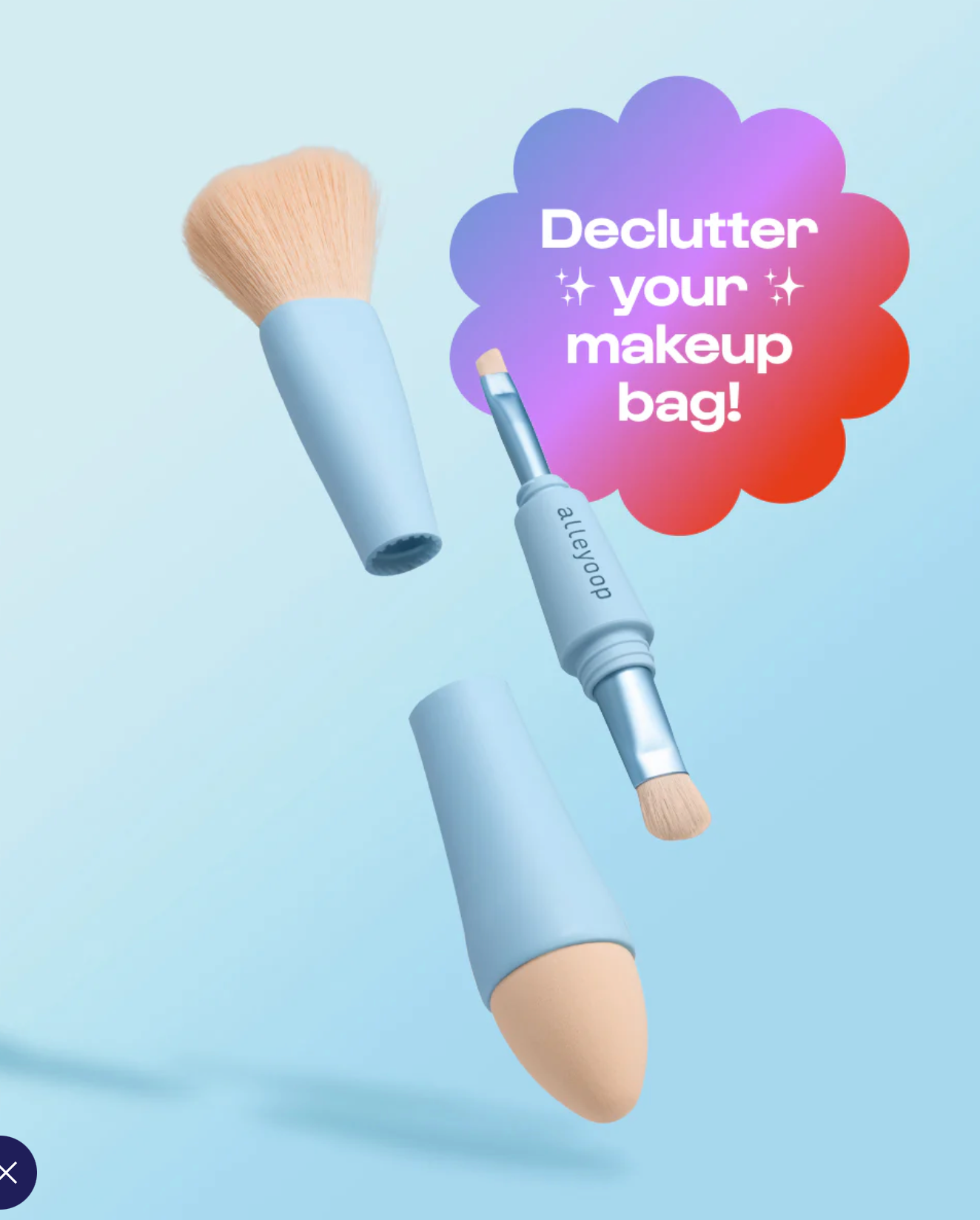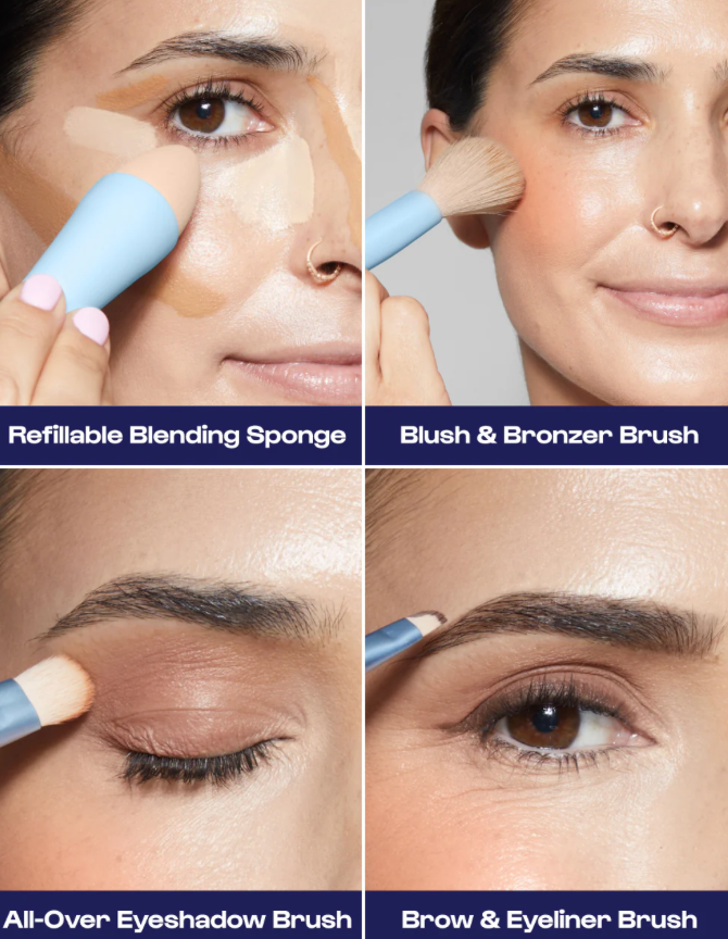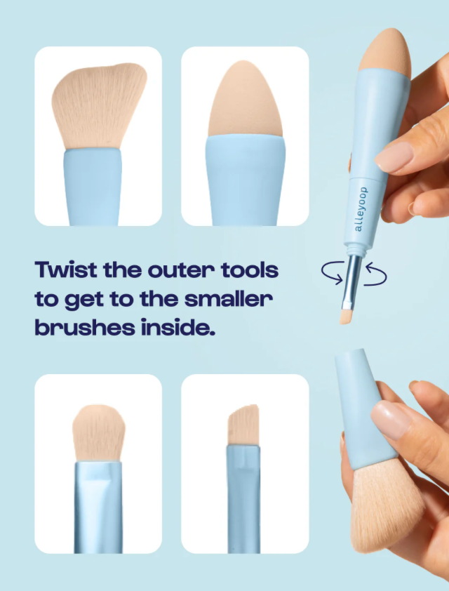 This Allure award-winning 4-in-1 makeup brush packs all your essential beauty applicators in one easy tool: Blush & Bronzer Brush, Blending Sponge (replaceable), Brow & Eyeliner Brush, and All-Over Eyeshadow Brush. Sweep, blend, blur, and line to your heart's content with this ultra-compact, travel-friendly MVP.