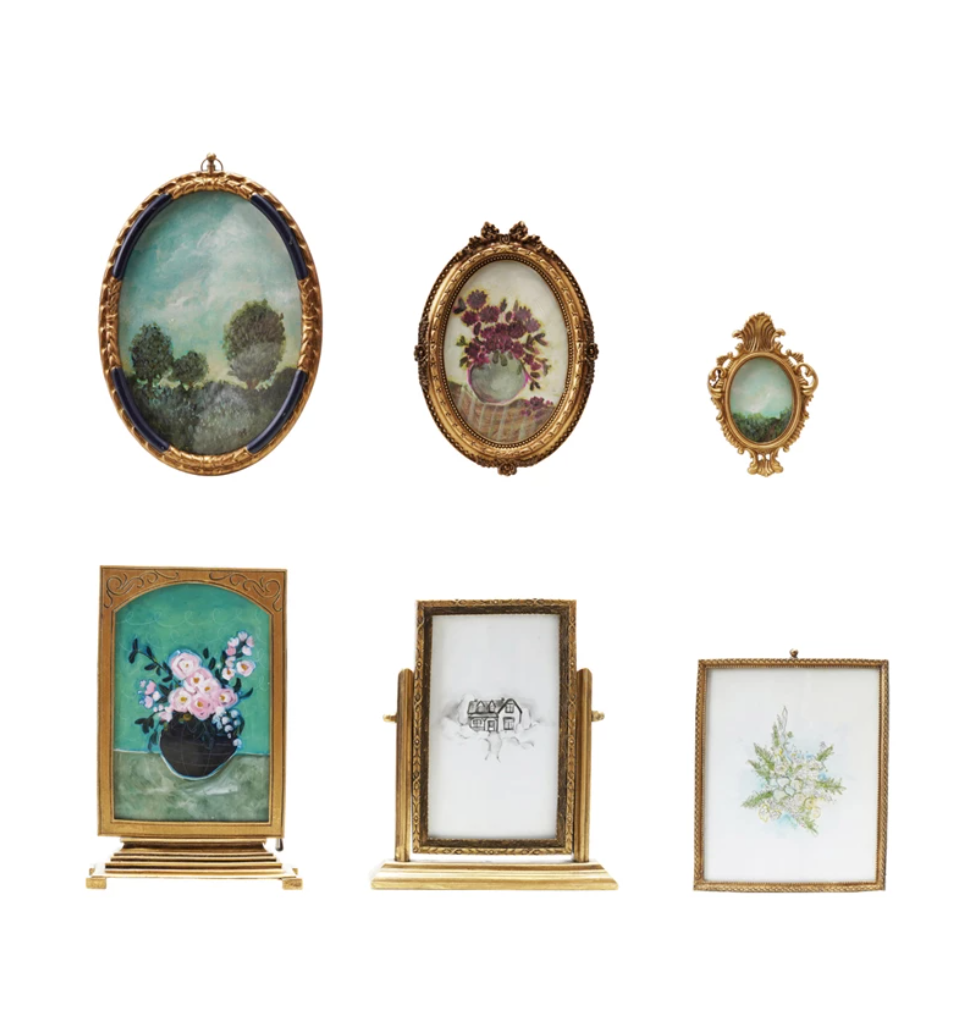 4"H - 8"H Pewter & Glass Photo Frames w/ Art, Brass Finish & Multi Color
