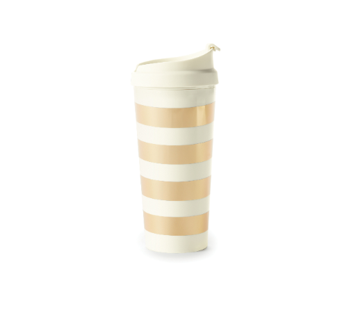 whether you fancy hot coffee or iced green tea, take it to go in this thermal mug, accented with a festive gold stripe. the bpa-, phthalate-, and lead-free construction means you can sip and savor safely.