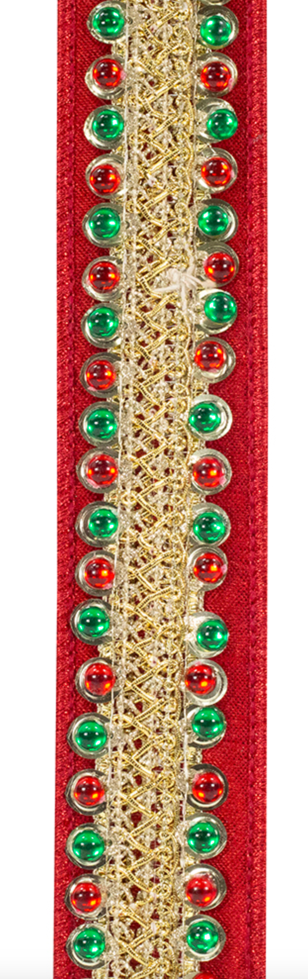 Add opulence to your holiday décor with the Jeweled Trimming Deluxe Metallic Two Sided Wired Edge Ribbon. This luxurious ribbon features glimmering jewel-like trim and a reversible metallic finish, offering rich color and dazzling shine from every angle. Its wired edges provide structure for dramatic bows, elegant accents, and standout seasonal styling.