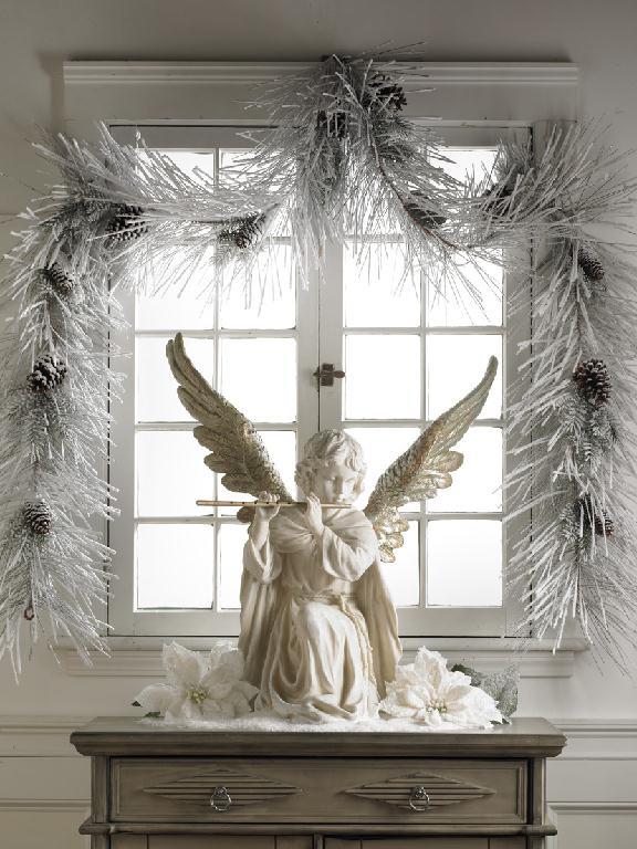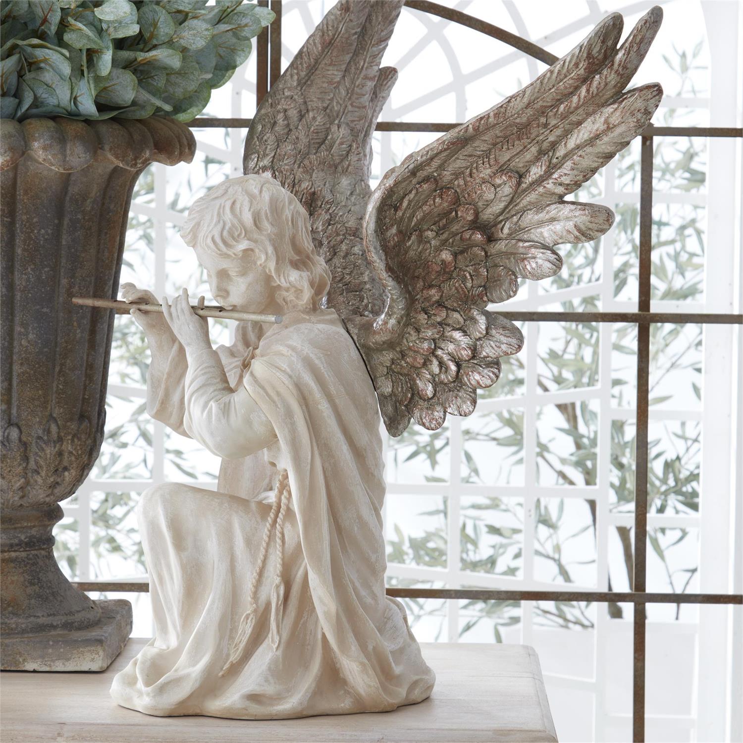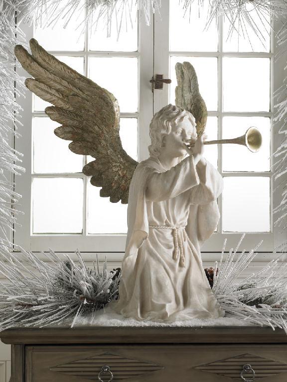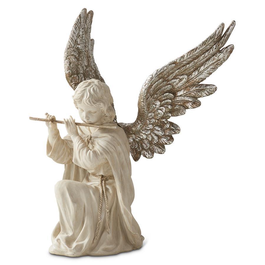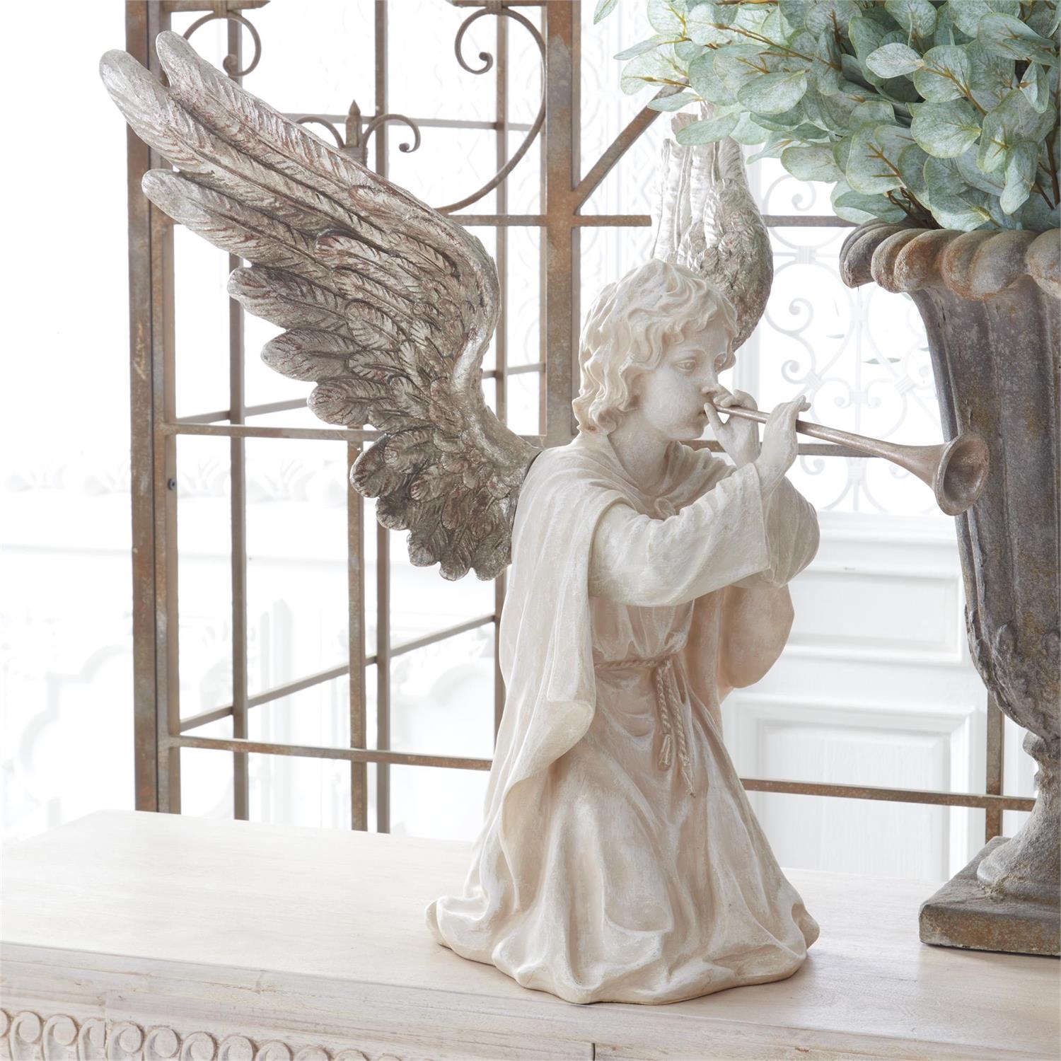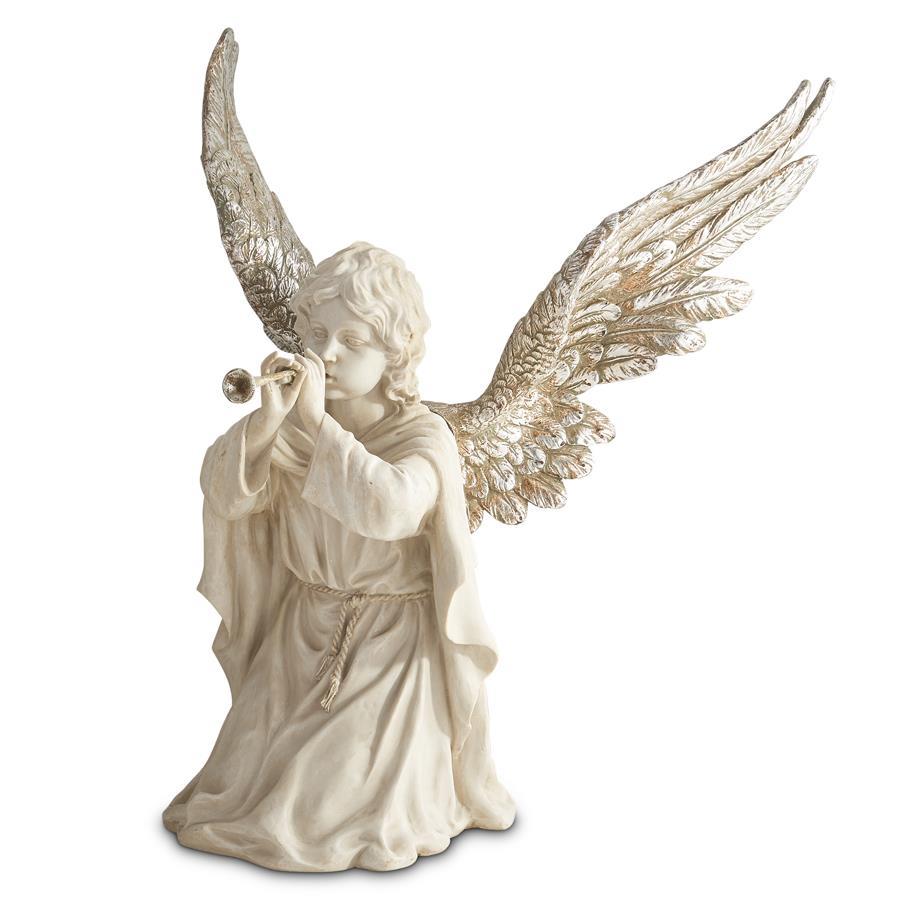 Standing 33 inches tall, this white resin angel crafted from durable polystone adds an elegant presence to any décor. Measuring 33H x 28W x 20D inches, it offers a commanding yet tasteful display piece suitable for indoor settings. Crafted with precision, this angel combines both artistry and quality materials for lasting appeal. Angel available with horn or flute.