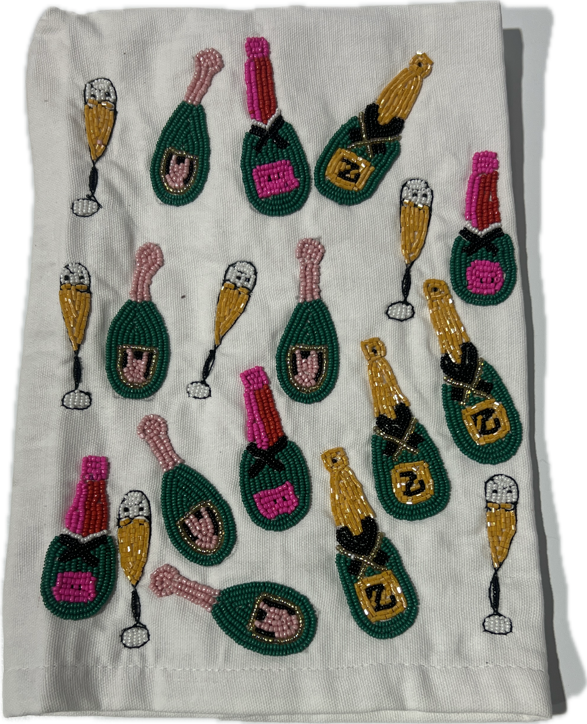 Add a touch of bubbly luxury to your kitchen with the Champagne Bottles Beaded Tea Towel. Adorned with sparkling beads that capture the festive spirit of champagne, this playful towel brightens up any space while being perfect for drying or decorating. Cheers to stylish and fun entertaining!
