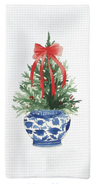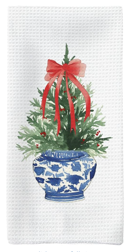 Blue and White Chinoiserie Christmas Decor Kitchen Towels, Red Bow Ribbon Christmas Tree Hand Towels, Grandmillennial Christmas Decor Dish Towels.