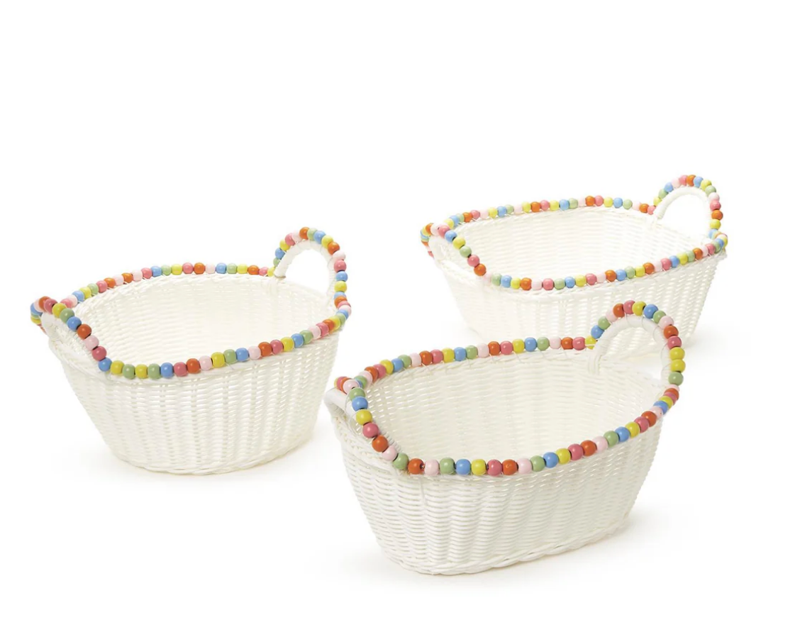 Hand-Woven Faux Wicker Basket with Multi-Color Wood Beads Trim