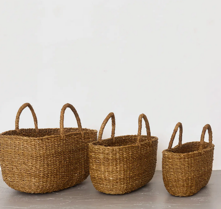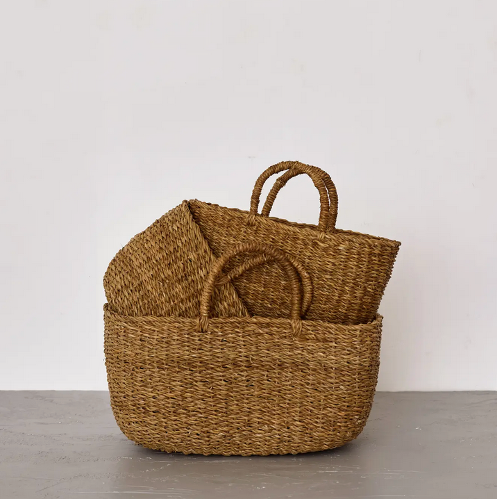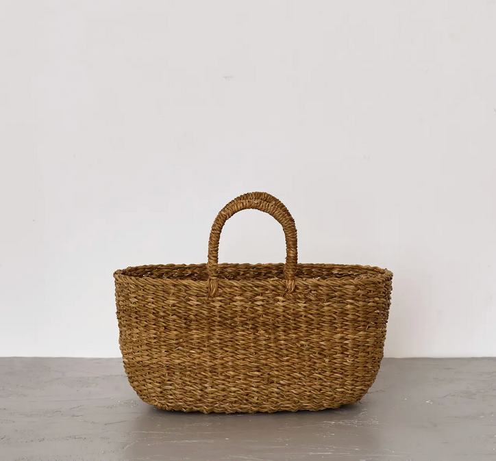 These oval gathering baskets are handwoven, crafted from hogla grass and feature sturdy handles for easy carrying throughout your home or on the go. Ready to serve as a functional basket for gathering treasures from your garden or local market, or use to create a lovely display. Hogla grass is an aquatic plant that's known for being sturdy and sustainable. Please note that due to its handwoven nature and material, the exact dimensions and texture of each harvest gathering basket will vary slightly.