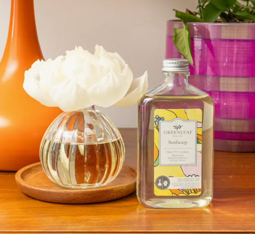 Our flower diffuser includes your favorite Greenleaf fragrance oil and a sola paper flower that emits a beautiful, blooming scent for up to 60 days! As the fragrance oils are absorbed through the wick, the flower begins to “bloom,” slowly emitting the fragrance and eventually resembling real flower petals. With the neutral color of the oil and the large flower, it will enhance and complement any space.
