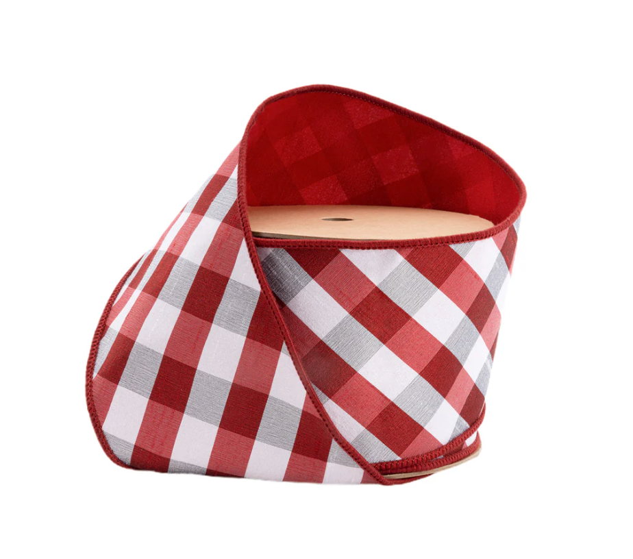 4" Wired Ribbon | Red/White Bias Check w/ Red Dupioni-fused Backing | 10 Yard Roll