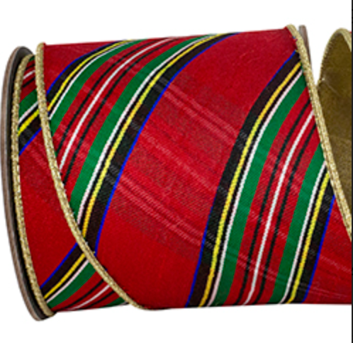 Multicolor Classic Diagonal Plaid Dupioni Deluxe Gold Backed Wired Edge Ribbon