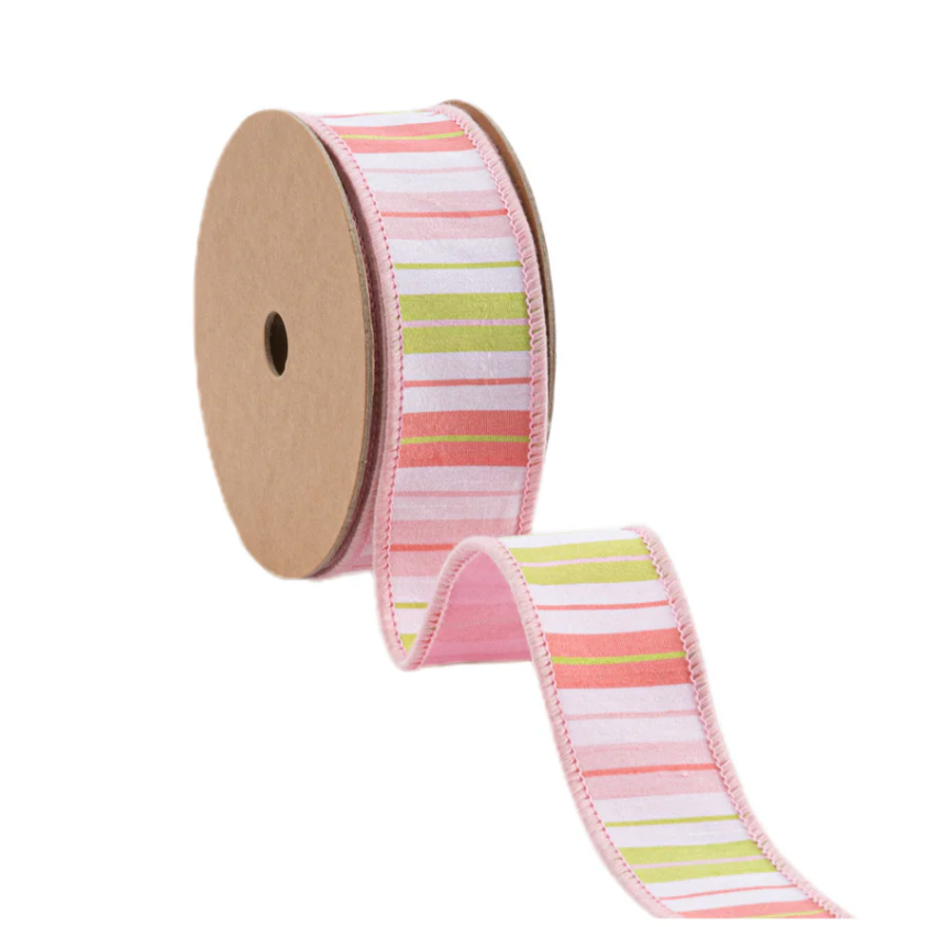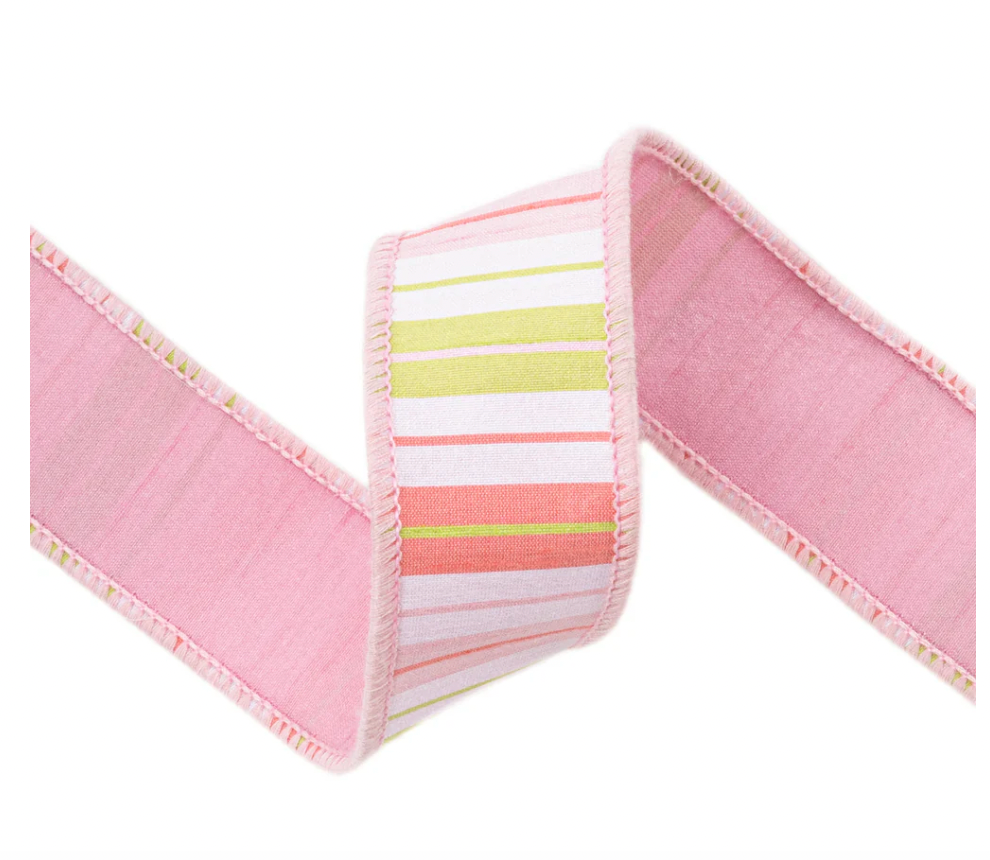 1.5" Wired Ribbon | Pink/Green/White Stripes w/ Pink Backing