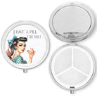 ✨ Keep your pills, vitamins, or “daily sanity savers” organized with a touch of sass! ✨ These retro-inspired pill organizers are as practical as they are hilarious. Featuring vintage pin-up art with sarcastic sayings like “Nope Not Today”, “This Pill Saves Lives… Mostly Yours”, and “Caffeine’s Backup Plan”, they’re the perfect mix of style and attitude. 💊 Details: Compact size: perfect for purse, pocket, or travel 3 compartments inside for easy organization Sturdy metal case with a push-button clasp 🎁 Perfect For: Everyday use (pills, vitamins, or even mints!) A funny, functional gift for moms, nurses, coworkers, or girlfriends Stocking stuffers, gag gifts, or bachelorette party favors Anyone who appreciates sarcasm with their supplements 💃 Why You’ll Love It: Because pills are boring… but your pill box doesn’t have to be! This little organizer keeps things stylish reminding everyone that your patience (and pain tolerance) has limits.