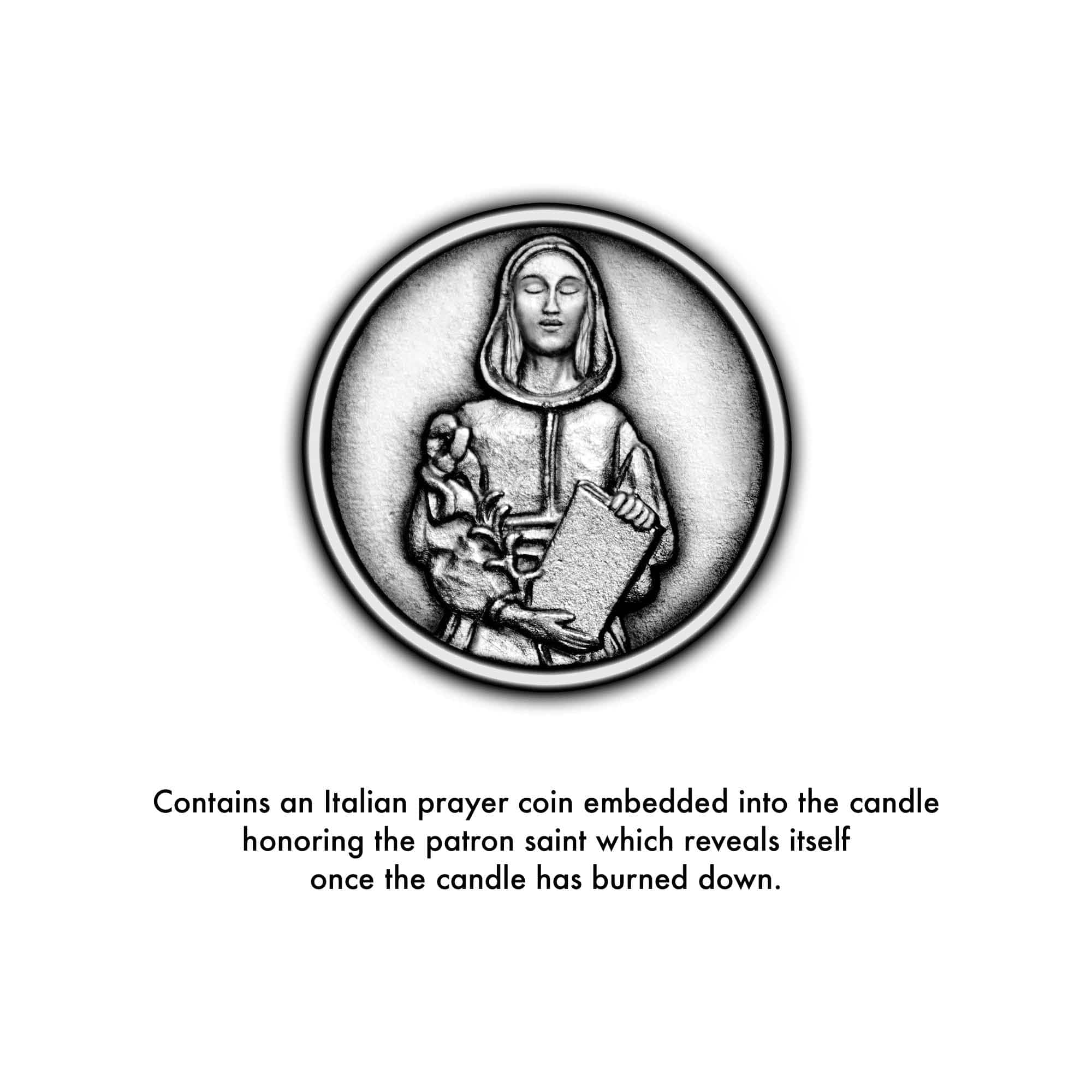 Each candle comes with a prayer to the patron saint, holy oil as part of the wax, and a prayer coin embedded into the candle. Before the first lighting, read out loud the prayer to the patron saint, then light the candle. Once the wax has burned all the way down after many uses, remove the coin at the bottom and keep it in your wallet, purse, or car - or bury it in your yard as a way of blessing the entire household.