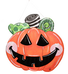 Give your front door a sweet and spooky upgrade with this oversized Jack-O'-Lantern PVC Door Hanger. Measuring 23.5" x 0.5" x 24", this cheerful pumpkin features a wide, toothy grin and playful pink cheeks, topped with colorful candy swirls in green and black for a whimsical Halloween twist. Made from lightweight, durable PVC and ready to hang, it’s the perfect way to welcome trick-or-treaters with festive flair and a whole lot of personality.