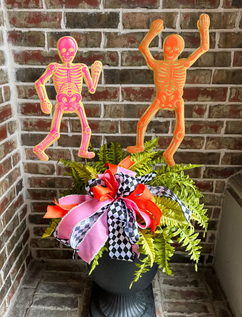 Bright Dancing Skeletons come in two sizes: 9" x 0.5" x 20" and 9" x 0.5" x 16". These vibrant decorations add a lively, spooky touch to any setting, perfect for enhancing Halloween displays or themed events with their dynamic design and bright appearance. Their slim profile allows easy placement in various spaces.