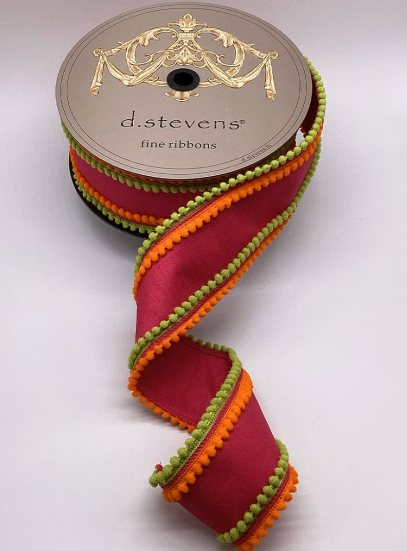 3" Hot Pink Dupion With Orange And Lime Pom Pom Trim