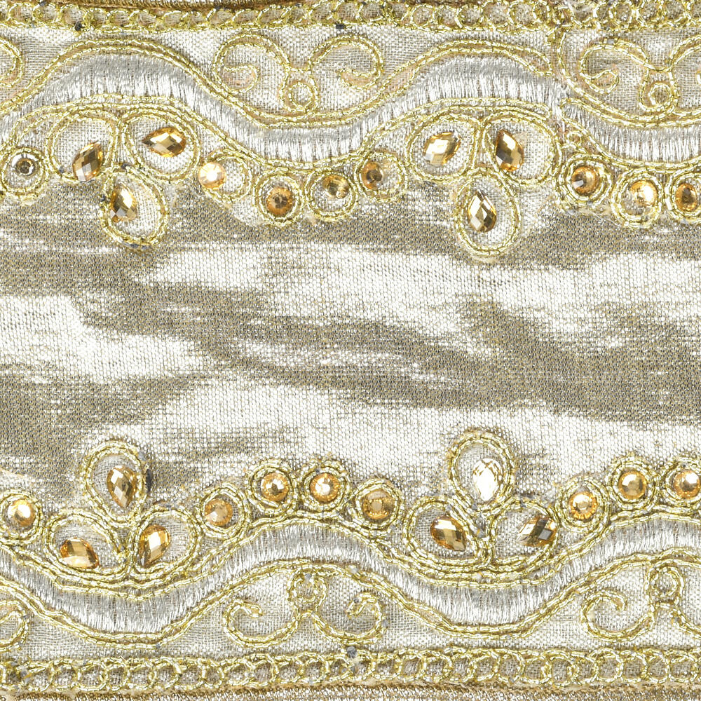 Add luxurious detail to your holiday décor with  4" x 5 Yards Champagne with Gold Embroidery Two-Sided Wired Edge Christmas Ribbon. Featuring an elegant champagne base with intricate gold embroidery, this double-sided ribbon is perfect for creating stunning bows, wrapping gifts, or accenting wreaths and garlands. The wired edge ensures easy shaping for beautiful, lasting designs.