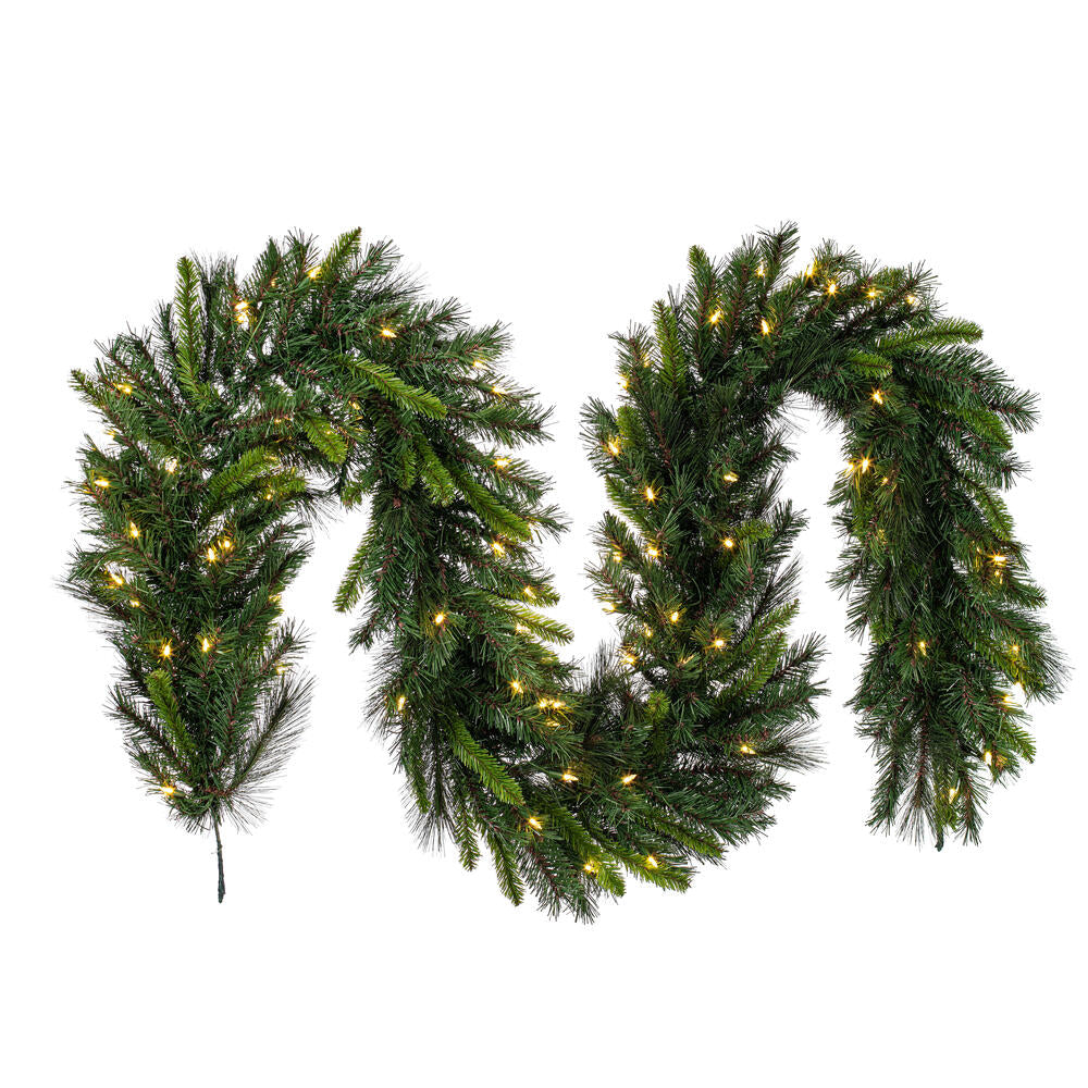 Brighten your holiday décor with the 9' x 14" Bangor Mixed Pine Artificial Christmas Garland. Pre-lit with warm white LED lights, this lush garland features a natural mix of pine branches for a full, festive look. Perfect for mantels, banisters, or doorways, it creates a welcoming glow and timeless Christmas charm.