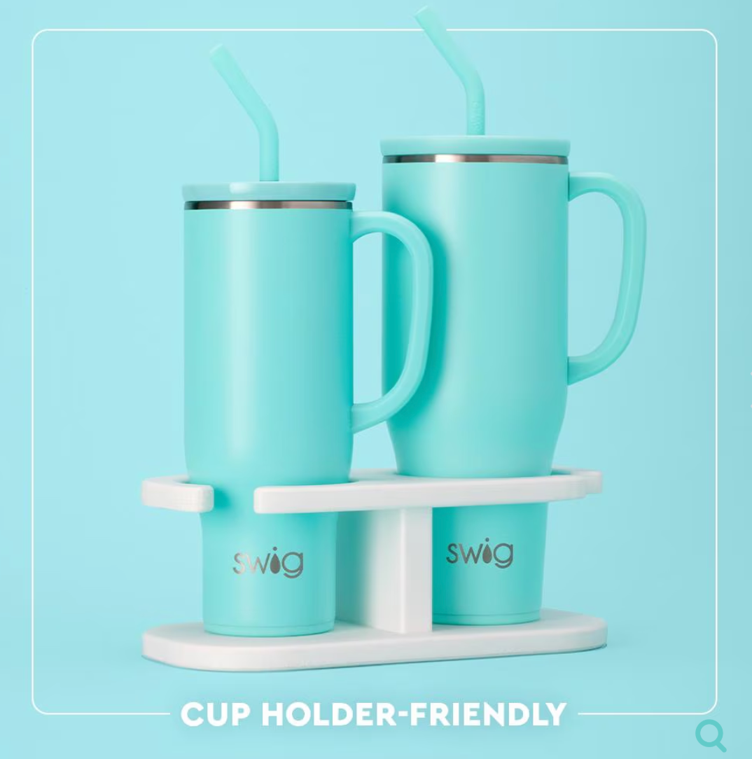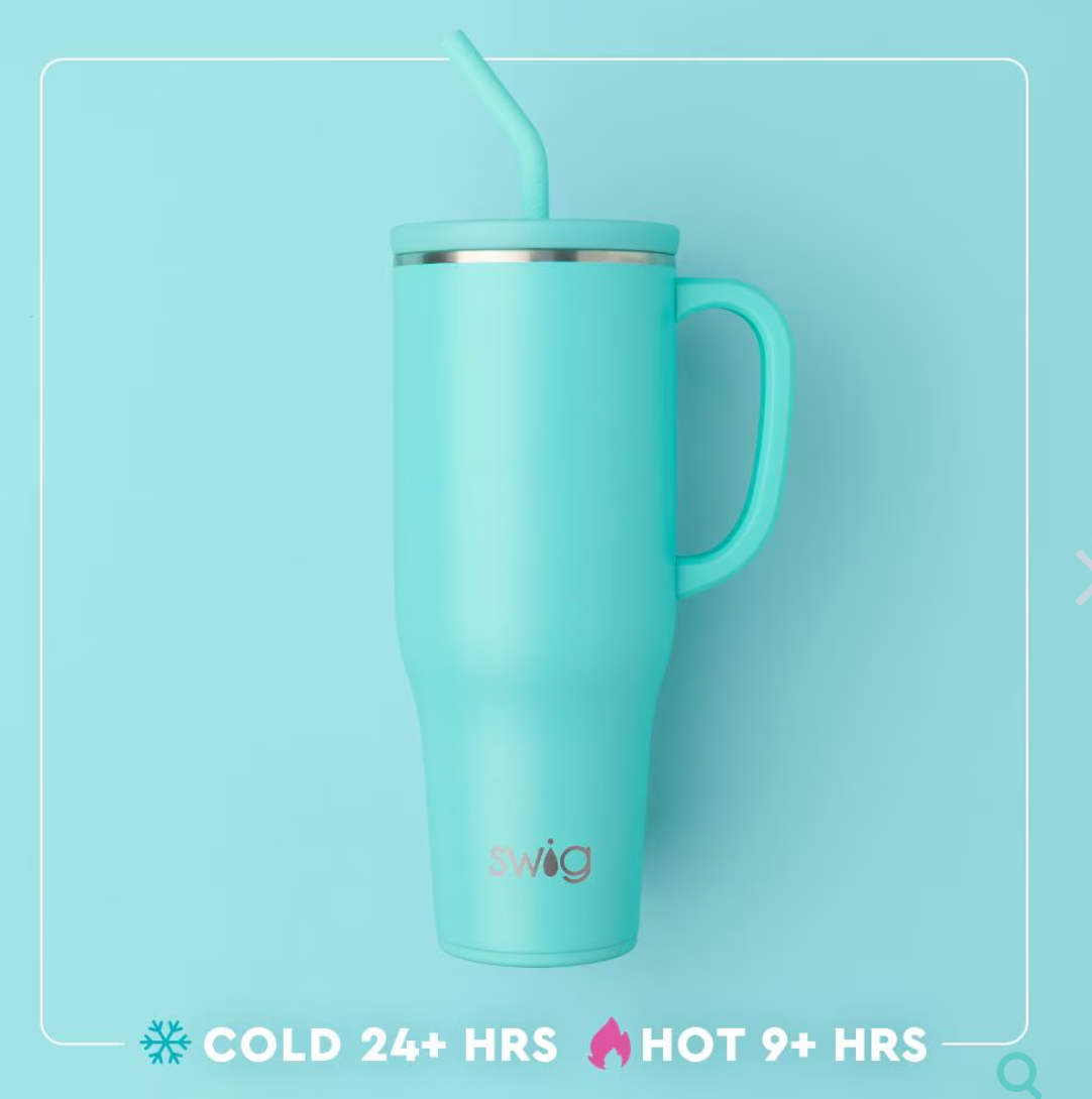 Hydrating has never been easier with our 40oz Insulated Mega Mug! A cup holder-friendly frame, a comfort-grip handle, and a plastic straw with a silicone flexi-tip all come together to create your new favorite Swig.