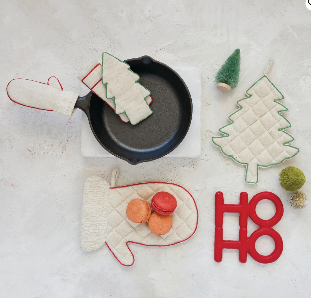 This cast iron trivet features a festive "HO HO HO" design, combining durability with holiday cheer. Its sturdy construction protects your surfaces from heat damage while adding a seasonal touch to your kitchen or dining area. Ideal for safely resting hot pots and pans during holiday gatherings, this trivet is both functional and decorative.