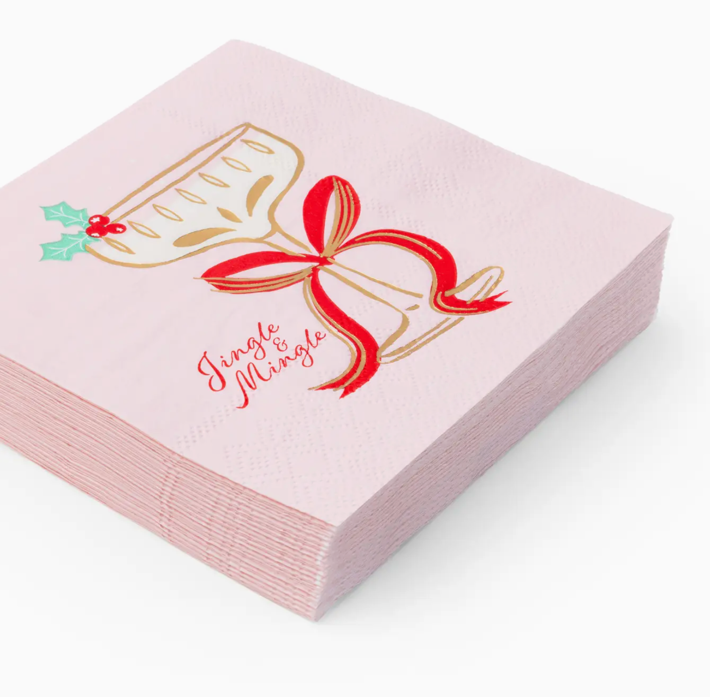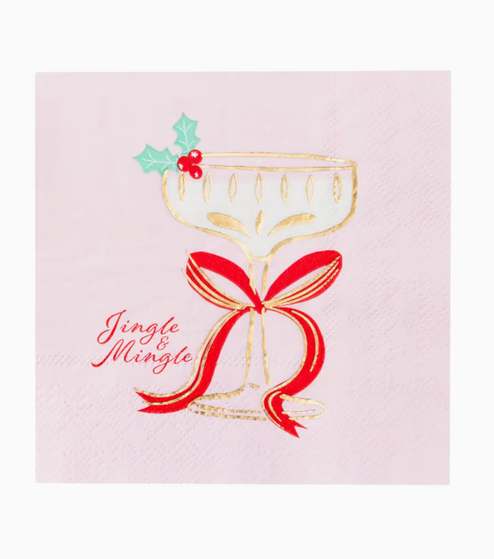 Add festive flair to holiday parties with these pink napkins featuring a cheerful Christmas cocktail design. Made with premium 3-ply paper and soy-based ink—perfect for seasonal entertaining or as a fun hostess gift. > Includes 20 party napkins > Size: 5" folded (Small/Cocktail Size) > Premium soy-based ink > 3-ply paper napkins > Not microwave-safe > FSC-certified paper, eco-conscious materials > Inspired by the French, Designed in America by Bonjour Fête