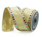Add a splash of sparkle and color to your crafts with the Kaleidoscope Ribbon. This gold ribbon features a vibrant, multicolor gem trim that catches the light beautifully, perfect for gift wrapping, decorating, or adding a touch of whimsy to any project. Let your creativity shine with this playful and eye-catching accent.