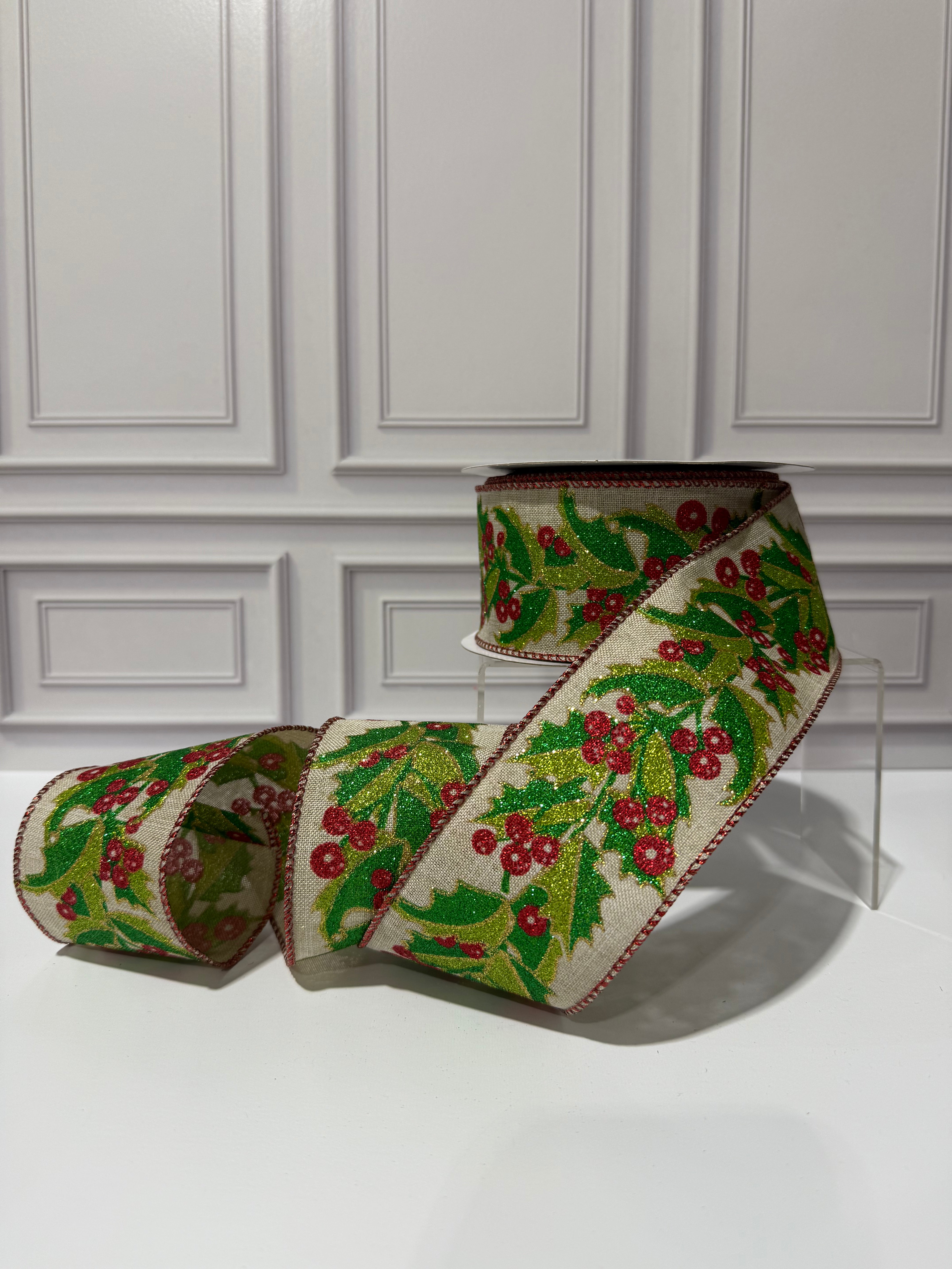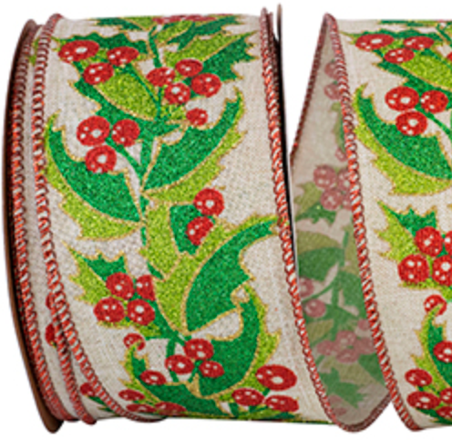Holly Glitter Extravagance Linen Wired Edge Ribbon