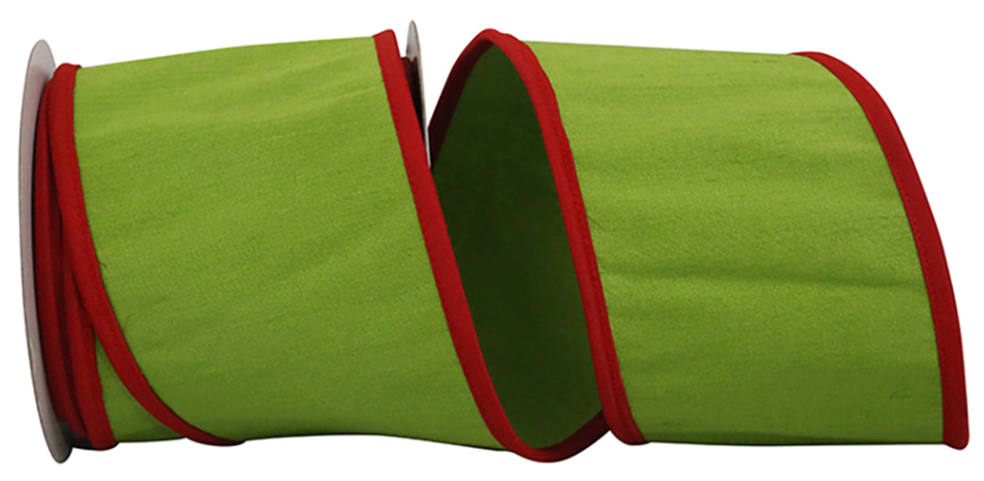 Elevate your gift wrapping and craft projects with this luxurious Dupioni ribbon, featuring a vibrant lime silk base accented by a striking red edge. The 4-inch width and generous 5-yard length provide ample material for bows, embellishments, and decorative applications. Dupioni's distinctive slubbed texture adds refined dimension and visual interest, making each creation stand out with understated elegance.