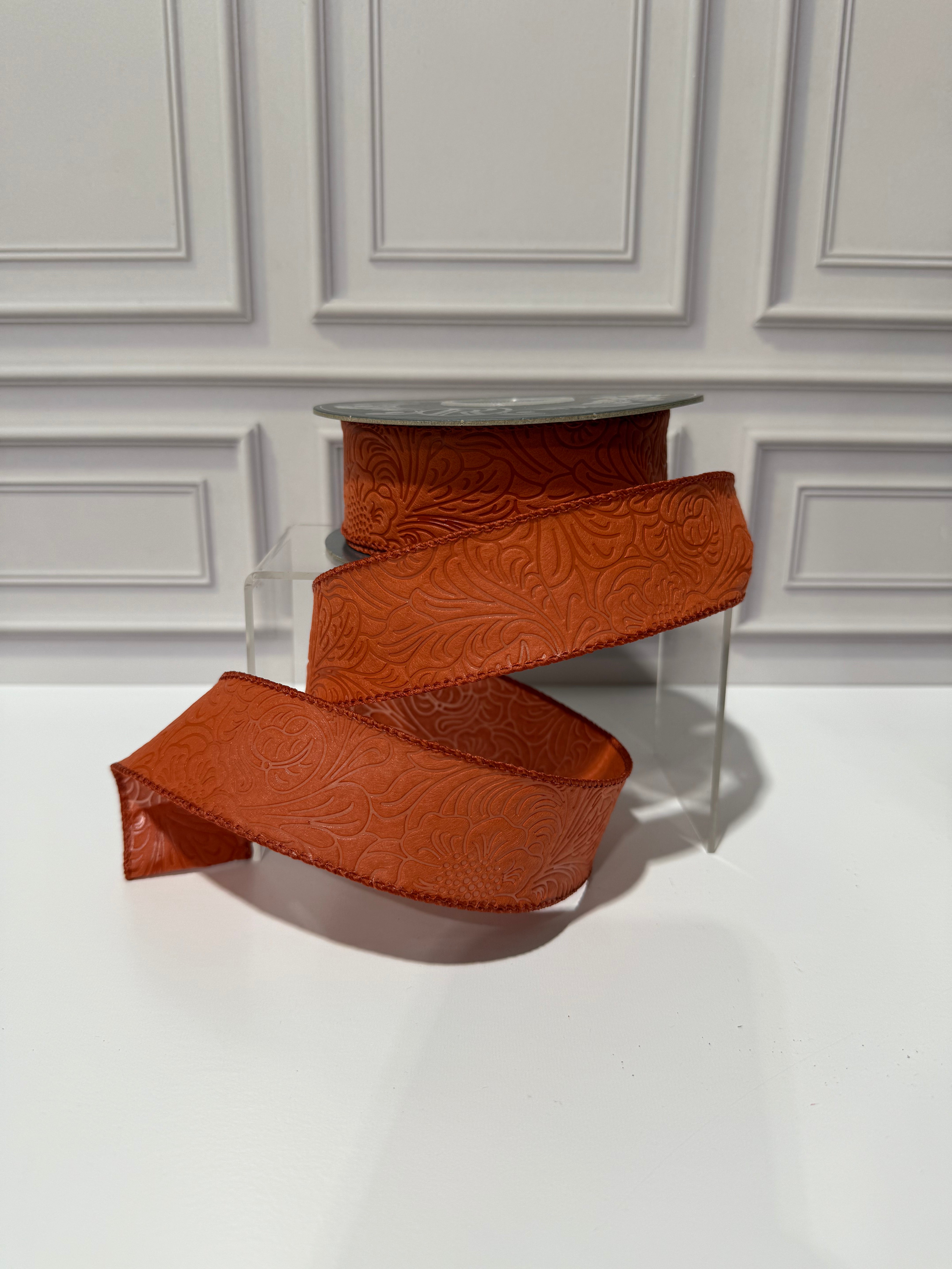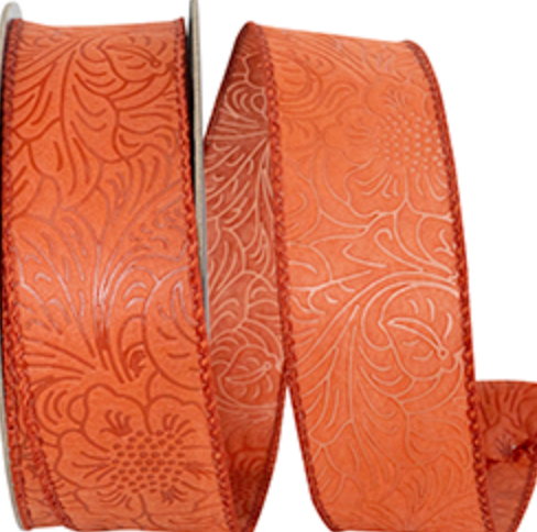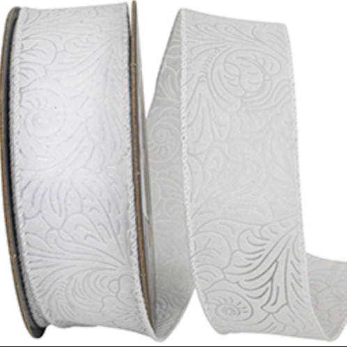 Add an elegant flourish to your décor with the Leaf Scroll Embossed Wired Edge Ribbon. Featuring a raised scroll and leaf pattern with a subtle sheen, this ribbon brings texture and sophistication to wreaths, garlands, and seasonal arrangements. The wired edge allows for effortless shaping and long-lasting designs.