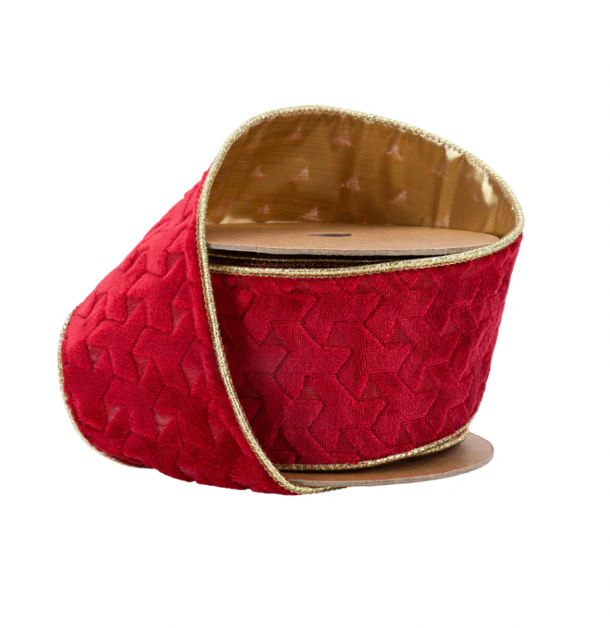 2 1/2" Wired Velvet Ribbon | Red Geometric Embossed with Gold Backing | 10 Yard Roll