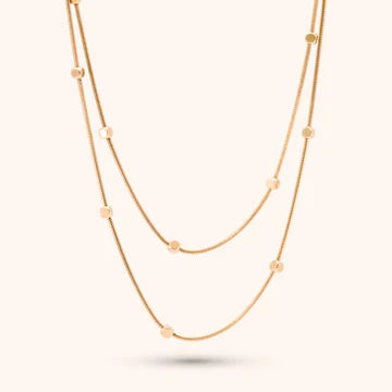 This delicate double-layered necklace adds a touch of subtle sophistication, with its shimmering gold tones and minimalist charm design.