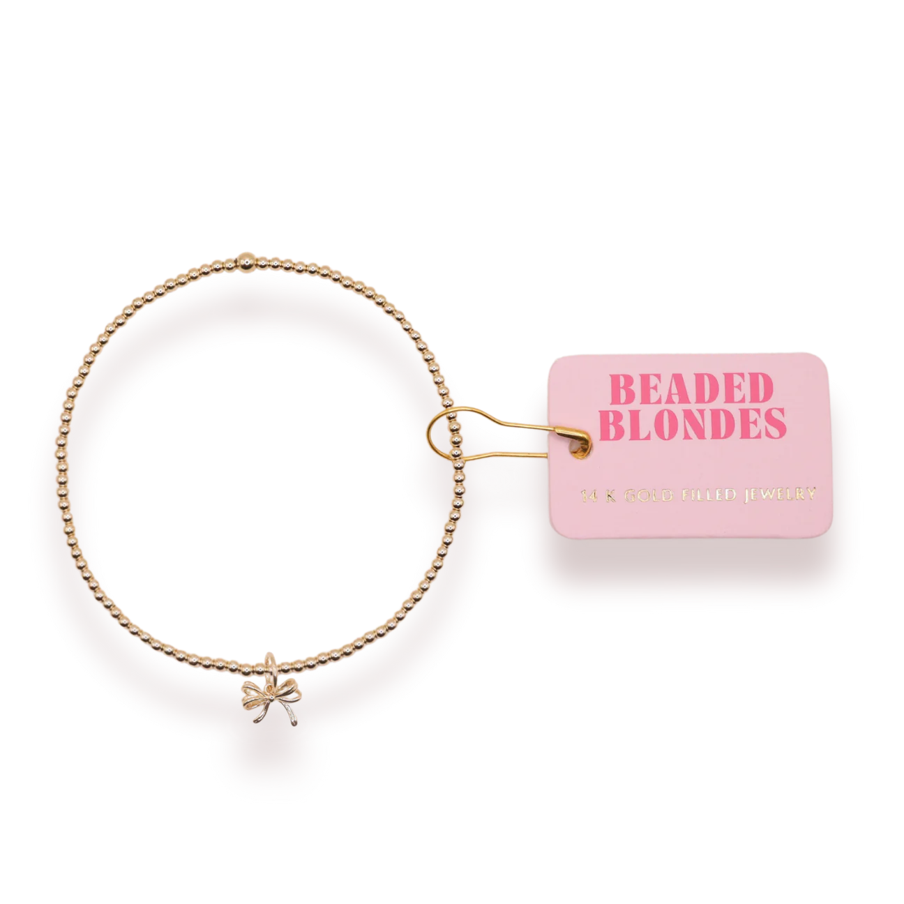 2MM gold beaded stretch bracelet with gold bow charm.