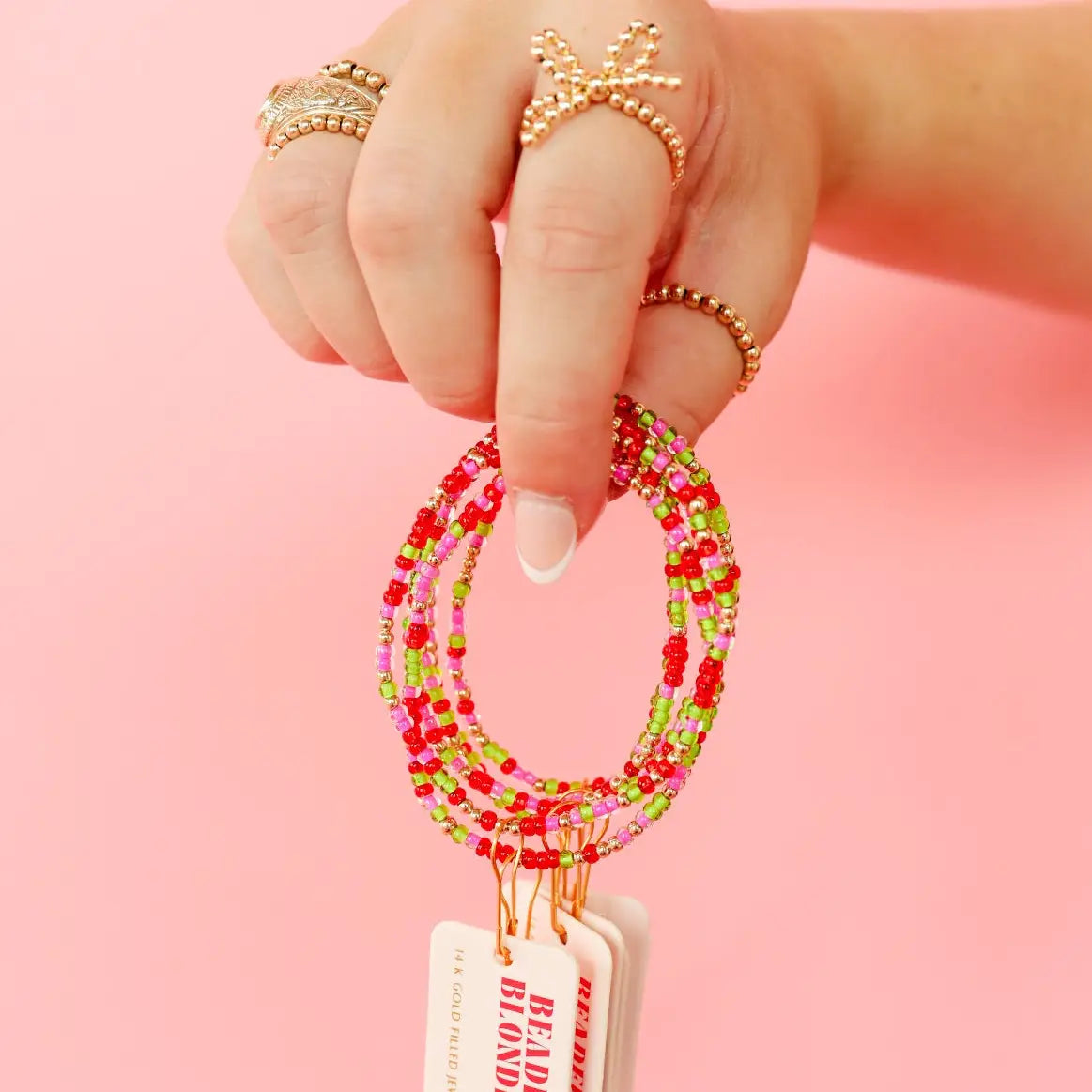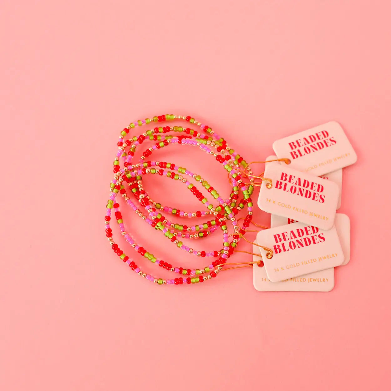 Beaded Blondes 2024 Holiday Bracelet. Add some color to your stack! This bracelet is made with colorful czech glass beads and 2.5mm 14k gold filled beads! ✨ Made with 14 K gold filled tarnish proof beads and durable elastic string.