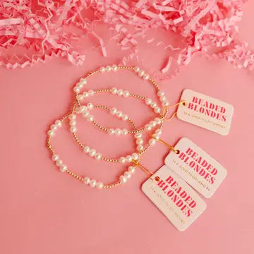 Mix of freshwater pearls & 14 k gold filled beaded bracelet. Material: 14 K gold filled beads, freshwater pearls and durable elastic string. Hand strung with love in College Station, Texas. Each bracelet is handmade and different!