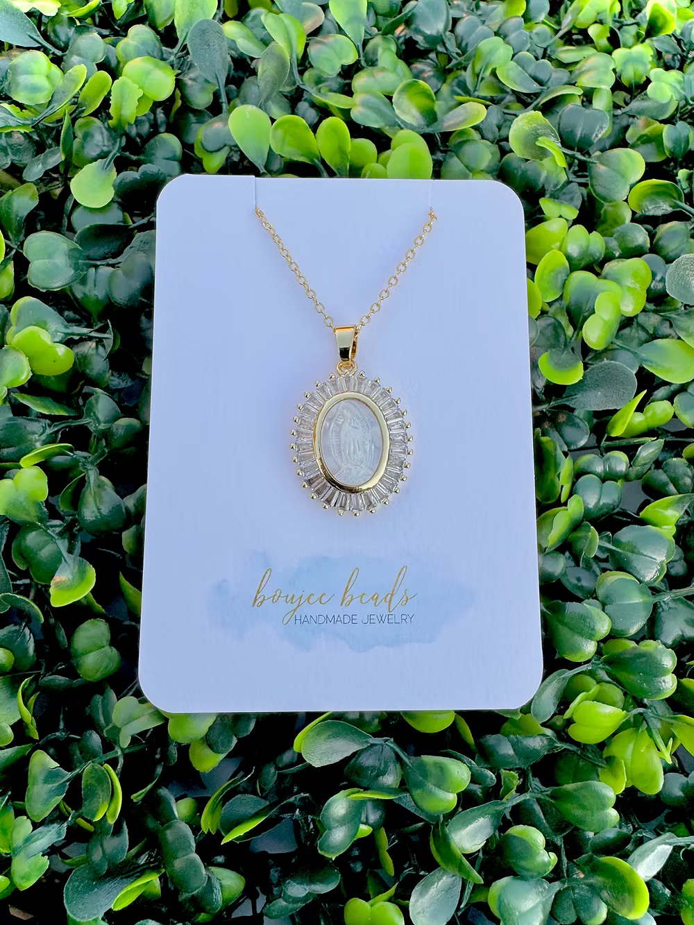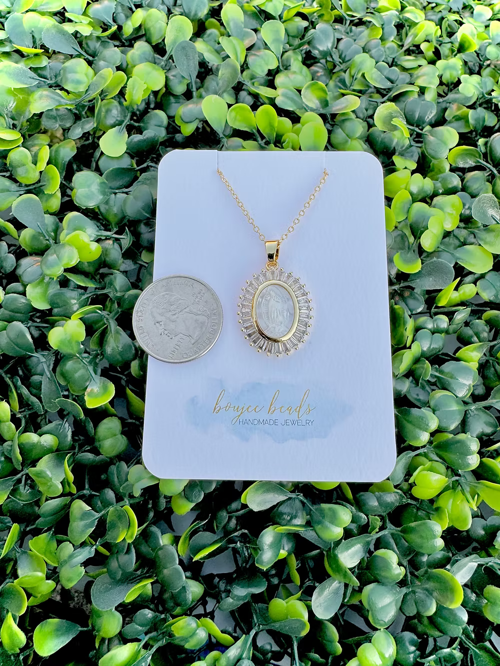 This elegant gold necklace features a beautifully detailed Mary Mother of pearl pendant, symbolizing love, faith, and protection. Perfect for everyday wear or as a meaningful gift, it adds a spiritual touch to any outfit.