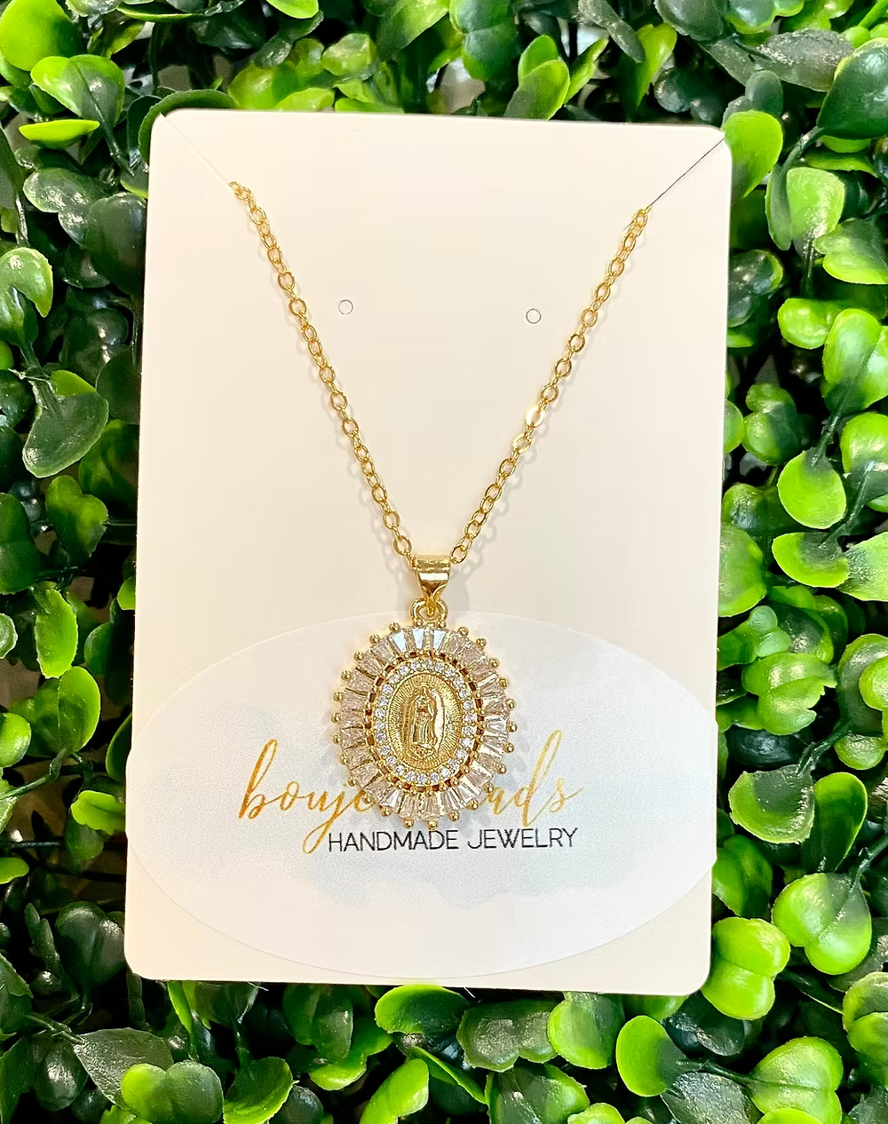 Timeless and radiant, the Perfect Mary Pendant Necklace is a graceful tribute to faith and beauty. This elegant gold necklace features a delicately crafted Virgin Mary pendant adorned with sparkling rhinestones, adding a touch of brilliance and reverence to your everyday style.