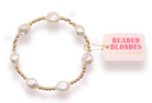 Add a touch of charm with the Sadie bracelet, featuring large synthetic pearls paired with delicate 3mm gold-filled beads. Handstrung with care in College Station, Texas, its 14K gold-filled elastic string makes it waterproof, workout-proof, and tarnish-resistant—perfect for everyday fun. Keep it away from harsh chemicals to maintain its sparkle!
