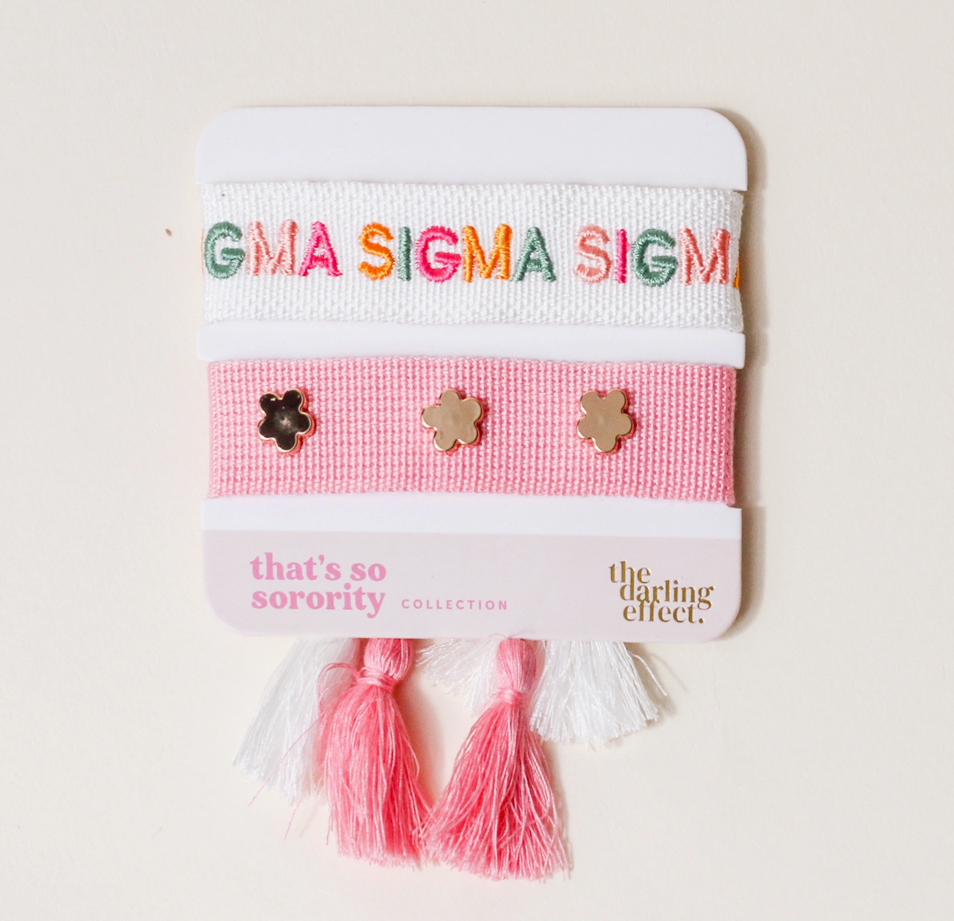 This Sorority Woven Bracelet Set is the perfect way to show off your chapter spirit! Featuring an adorable gold flower detail on one bracelet, and embroidered letters on the other, this new trendy accessory is lightweight and fun! This woven bracelet is the ultimate accessory to celebrate your unique bond and show love for your chapter.