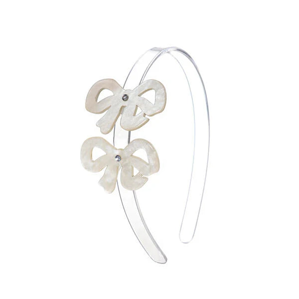A stylish headband adorned with double pearlized white bows from the Fancy collection.