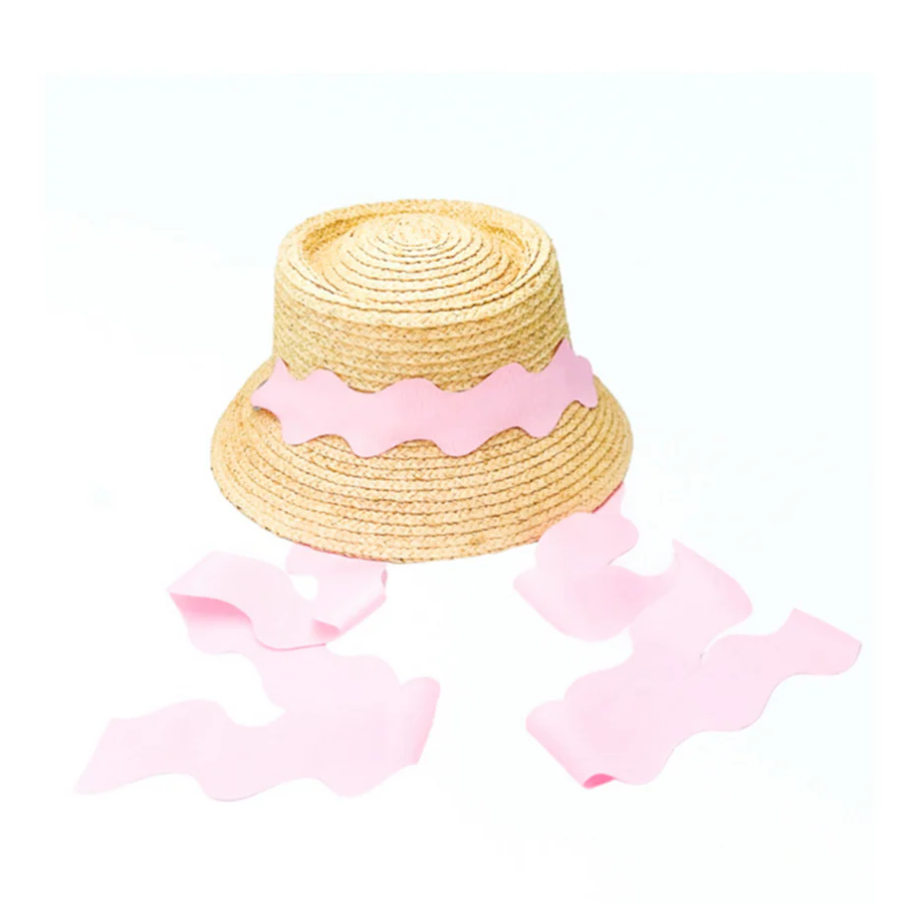 This stylish straw hat offers pretty protection from the sun. Each is integrated with a scalloped pink grosgrain ribbon in a shape that mimics the ocean’s waves to add a bit of whimsy for beach days, pool play dates, picnics, parties, and everywhere in between.