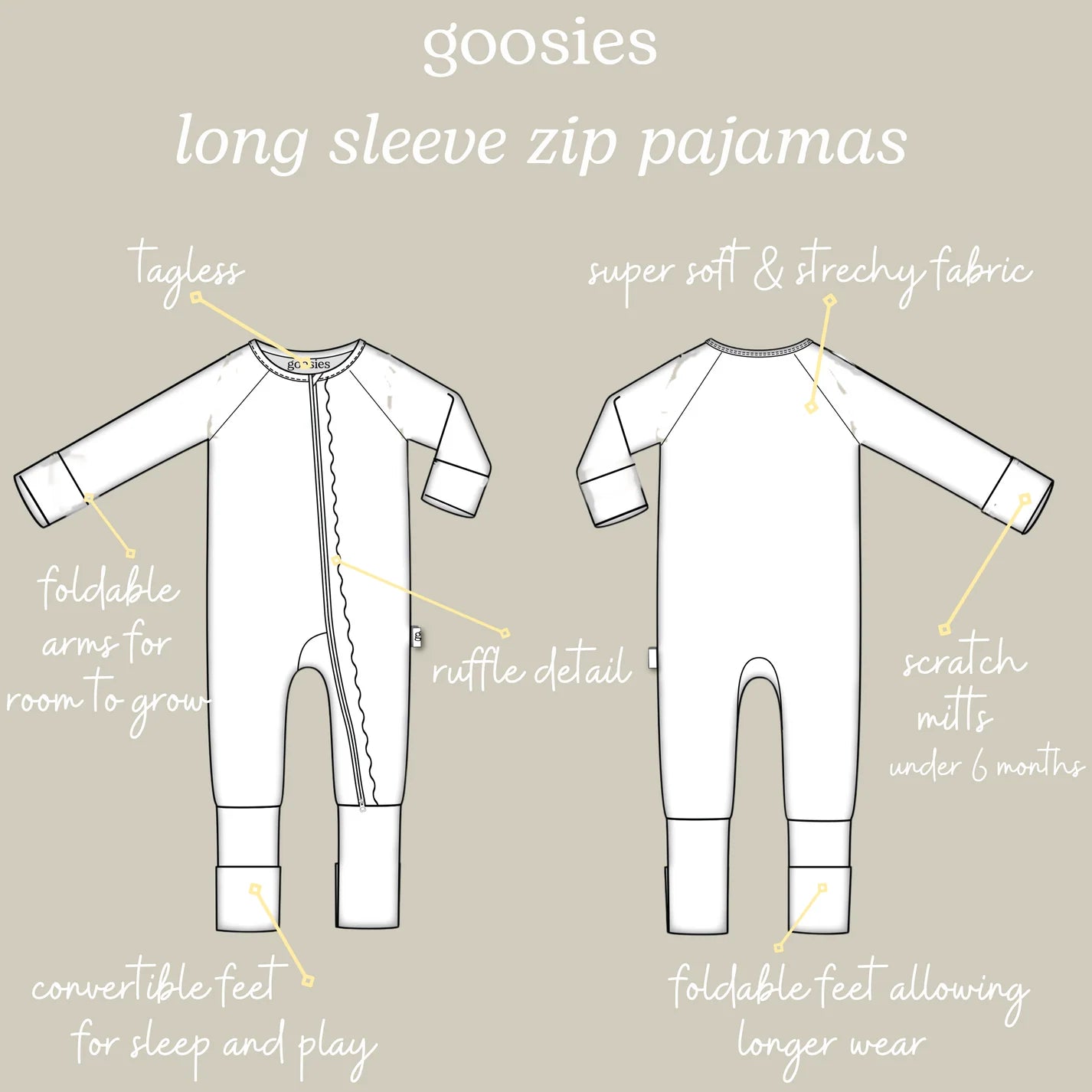 Our Zip Pajamas feature a two way zipper for easy diaper changes, convertible feet and scratch mitts for sizes 0-3 months and 3-6 months.