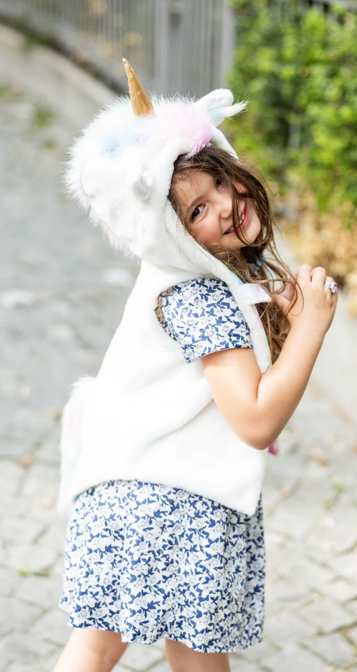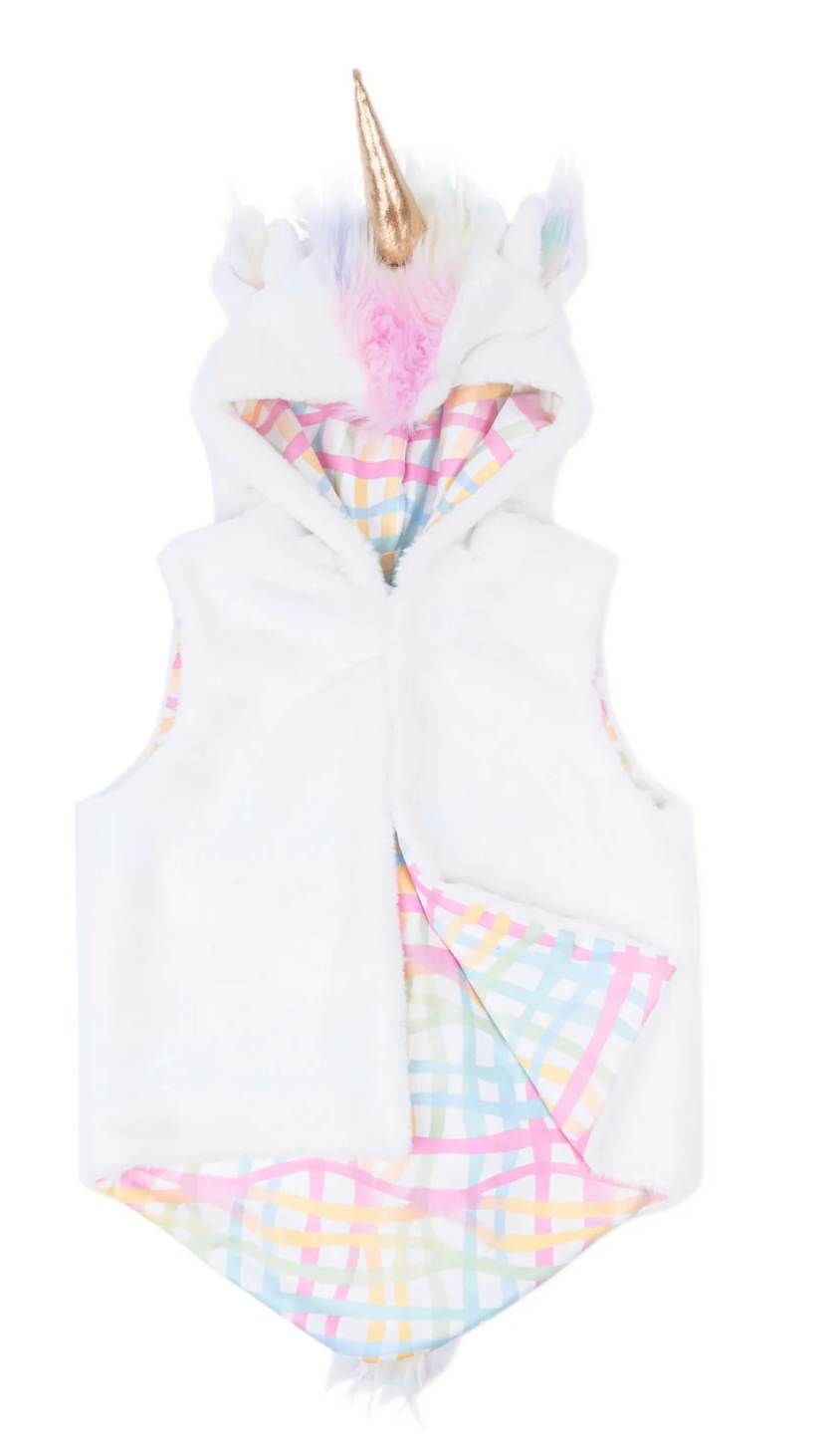Bring a touch of magic to everyday adventures with The All Day Everyday Unicorn Vest! Made from soft white fur, this enchanting vest features a shimmering gold unicorn horn, accented with pastel fur at its base for an extra dose of whimsy. Lined with a beautiful pastel gingham fabric, the vest offers both comfort and style, making it perfect for imaginative play or adding a magical flair to any outfit.