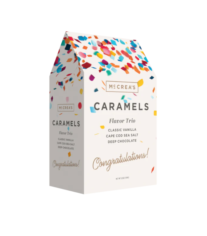 Celebrate life’s special milestones with McCrea’s Congratulations Gable Box. Ideal for graduations, weddings, showers, retirements, and any occasion worth toasting, this elegant gift is sure to delight. Inside are 15 individually wrapped caramels—five each of Classic Vanilla, Cape Cod Sea Salt, and Deep Chocolate—bringing a sweet touch to every celebration.