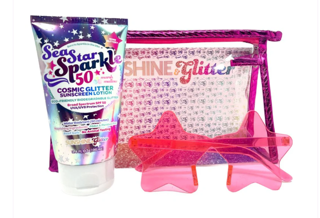 1 - 3.4 oz bottle of Cosmic Stardust SPF 50 with marshmallow scent and iridescent cosmic biodegradable glitter
